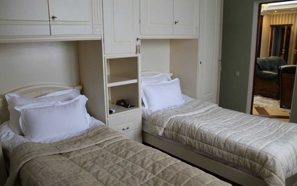 Мебель: вешалка, зеркало, кровати односпальные /одна двуспальная кровать, прикроватные тумбочки, стол, стулья, тумба, тумба багажная, шкаф.