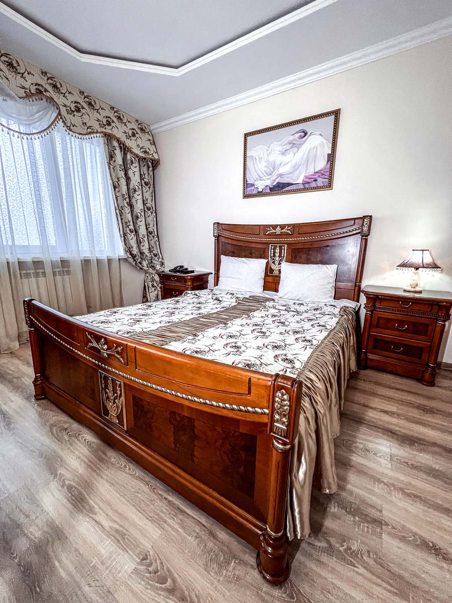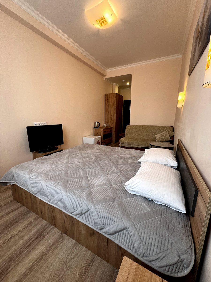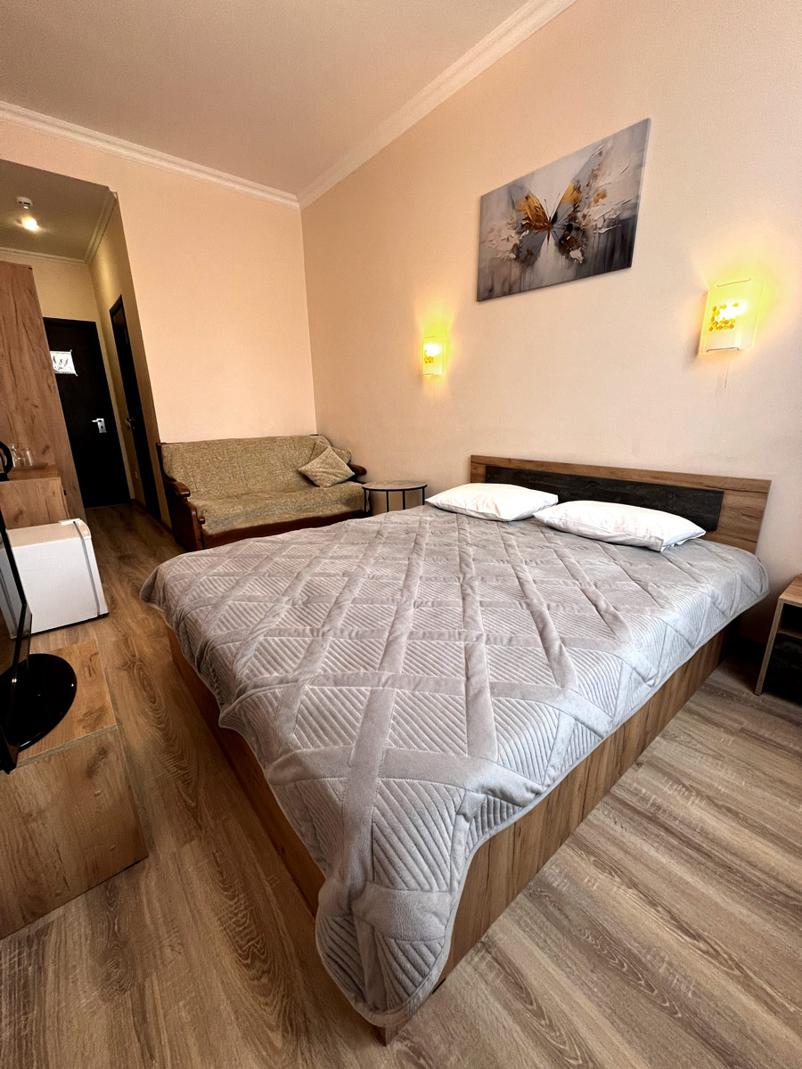 Мест в номере: 2 основных (двуспальная кровать) + 2 дополнительных (диван-кровать).