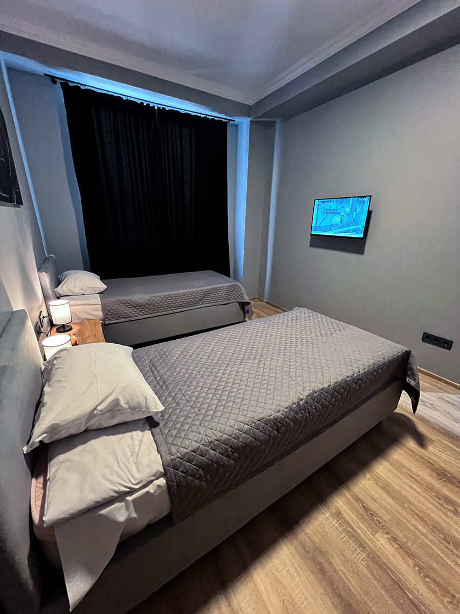 Мест в номере: 4 гостя (двуспальная кровать или 2 односпальные кровати).