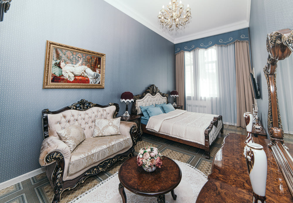Мебель: гардеробная, диван, зеркало, кресло, кровать двуспальная, прикроватные тумбочки, стол, стулья, тумба, шкаф.