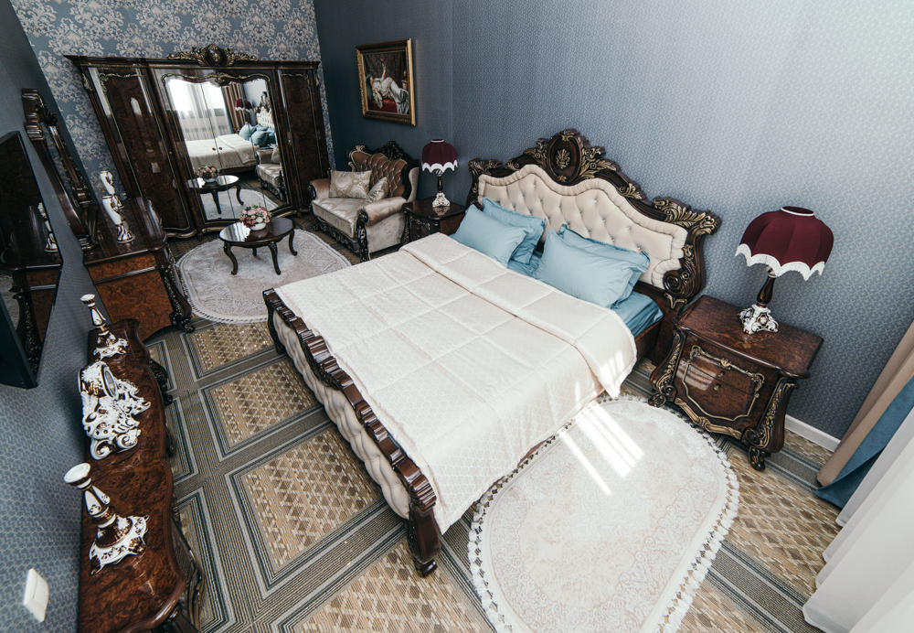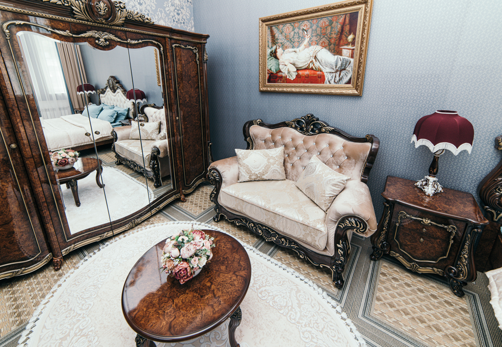 Мебель: гардеробная, диван, зеркало, кресло, кровать двуспальная, прикроватные тумбочки, стол, стулья, тумба, шкаф.