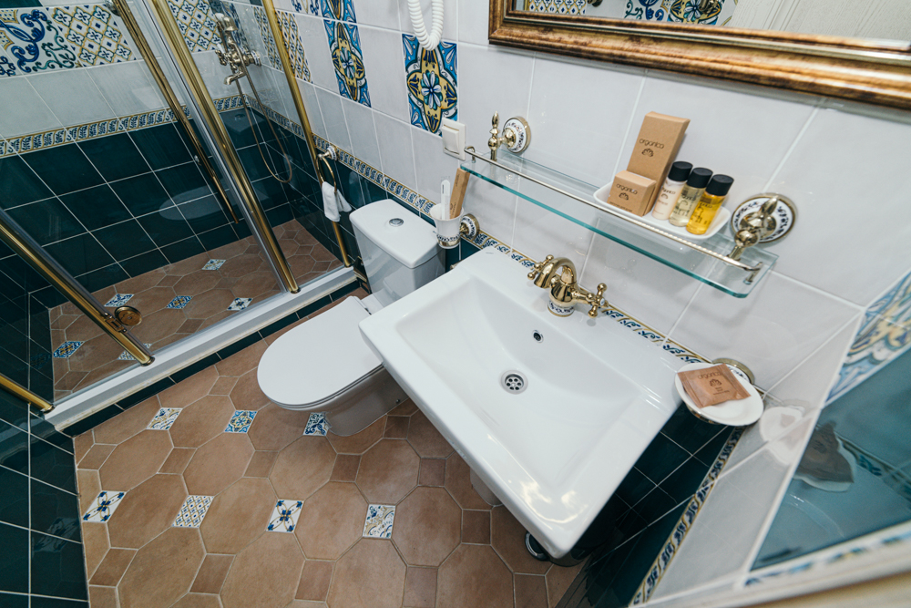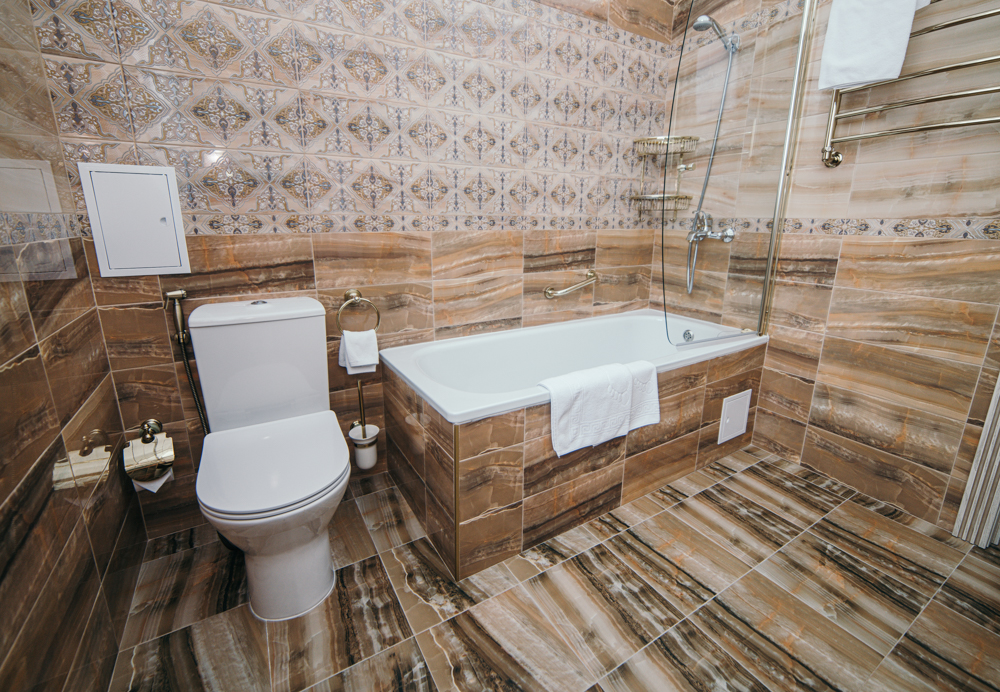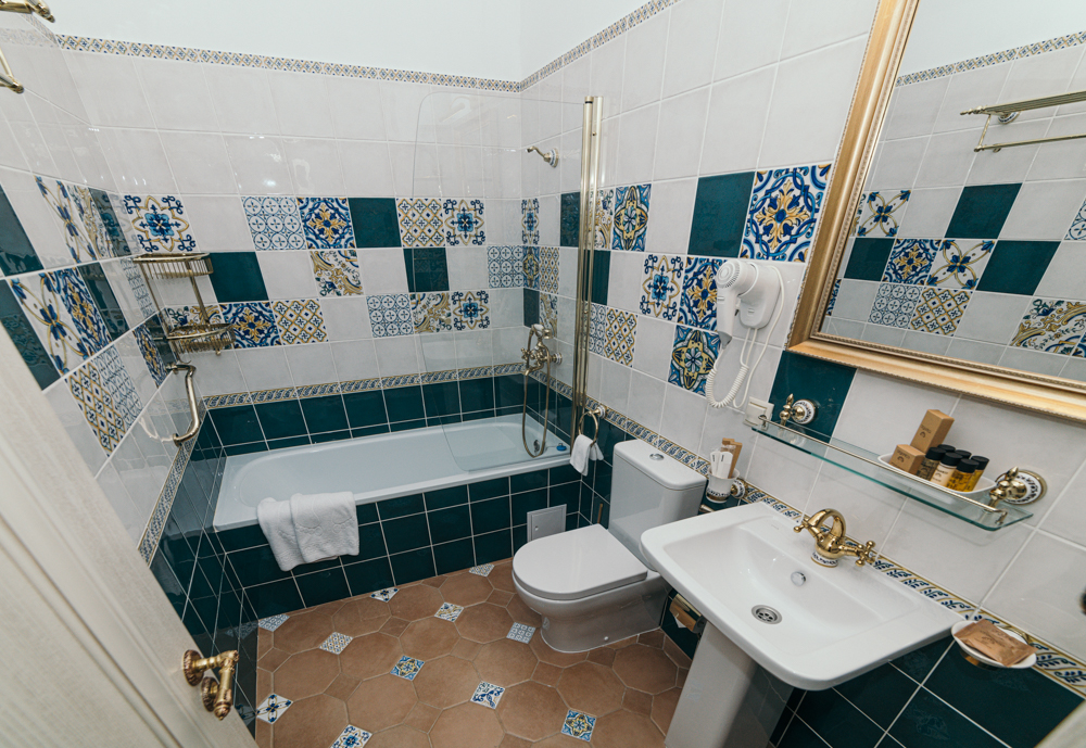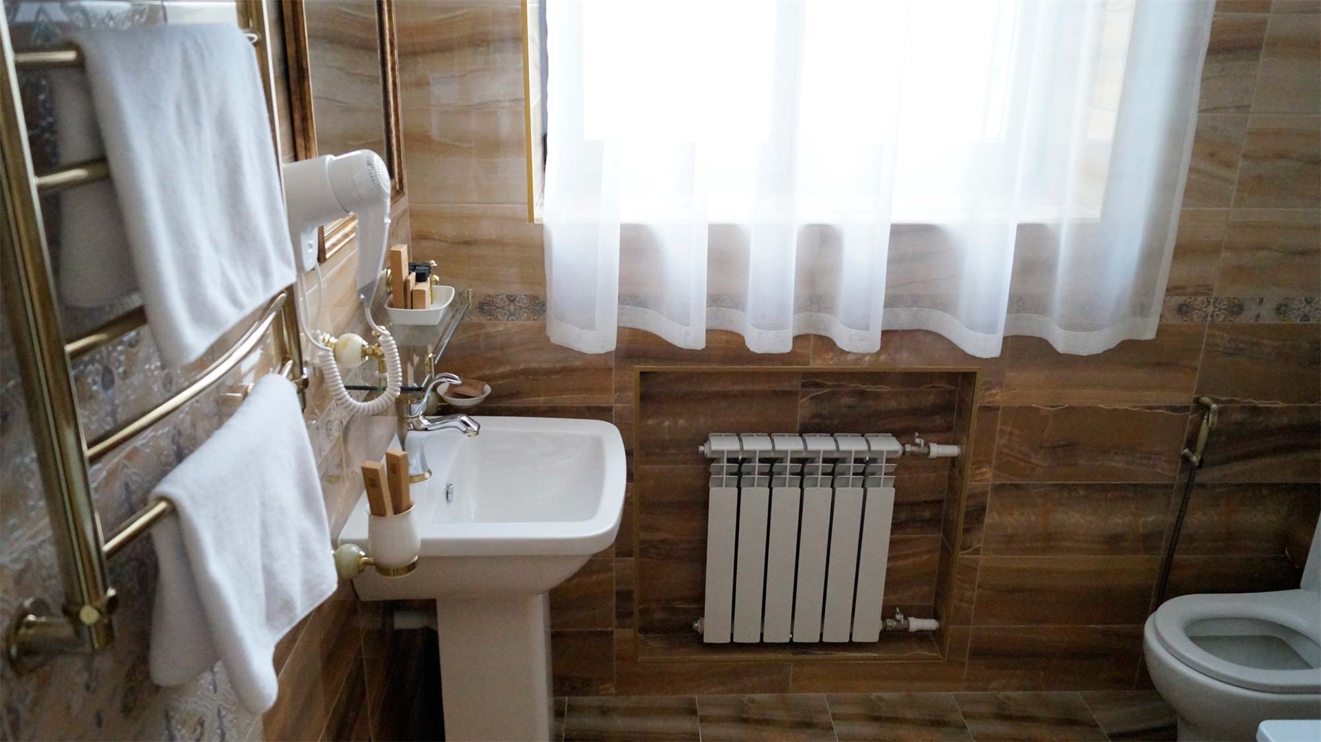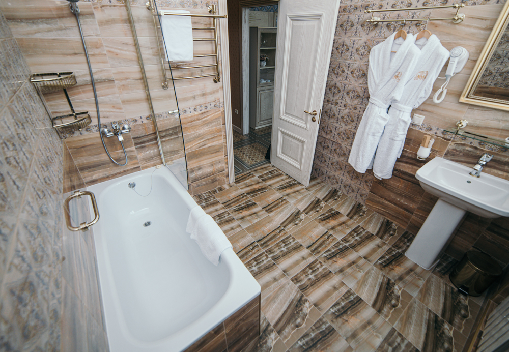 Санузел: с душем или ванной, тапочки, туалетные принадлежности, фен, халат.
