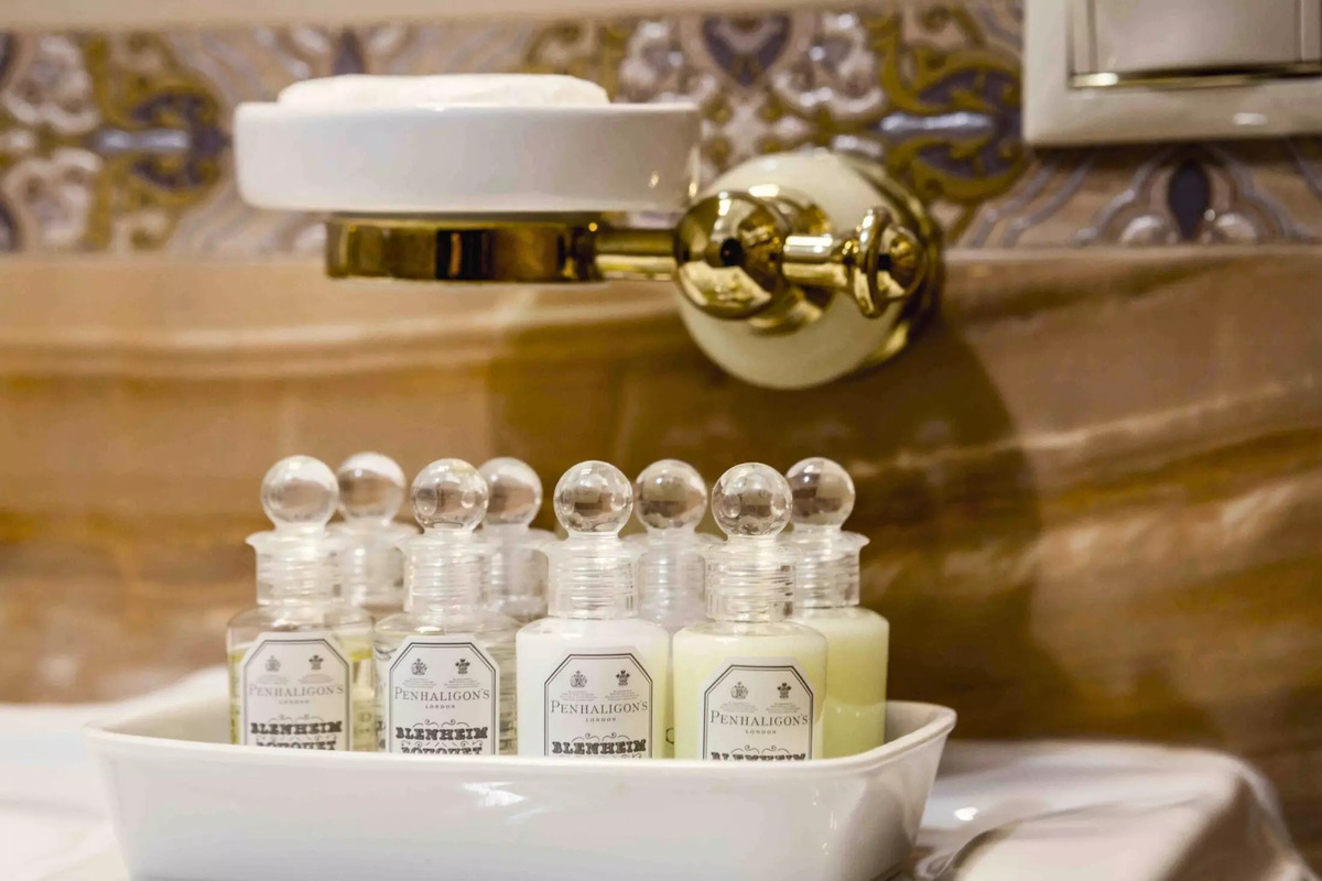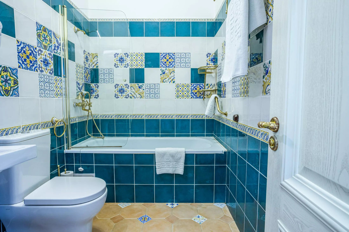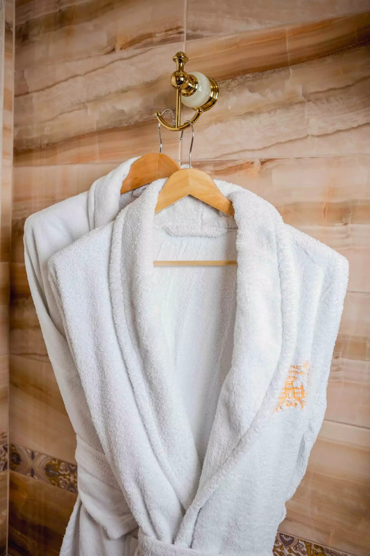 Санузел: с душем или ванной, тапочки, туалетные принадлежности, фен, халат.