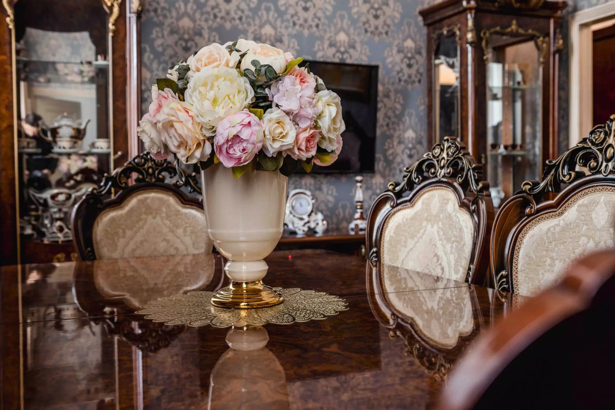 Мебель: гардеробная, диван, зеркало, кресло, кровать двуспальная, прикроватные тумбочки, стол, стулья, тумба, шкаф.