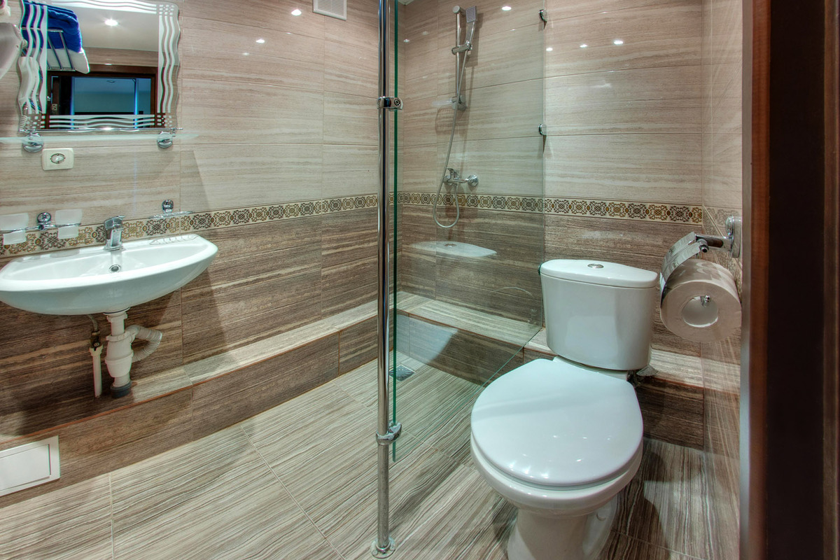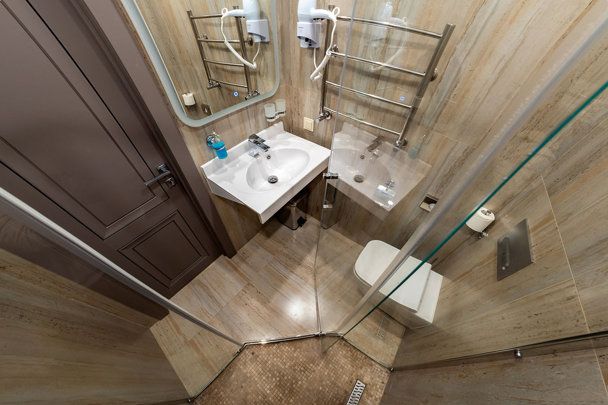 Санузел: с душевой кабиной, туалетные принадлежности, фен.