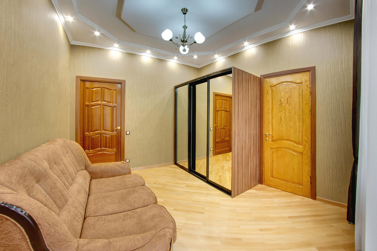 Мебель: диван, зеркало, комод, кровать двуспальная, набор мягкой мебели, прикроватные тумбочки, стол, стулья, шкаф, шкаф для посуды.