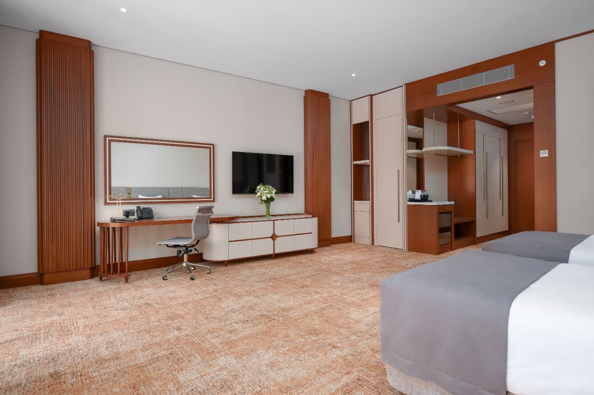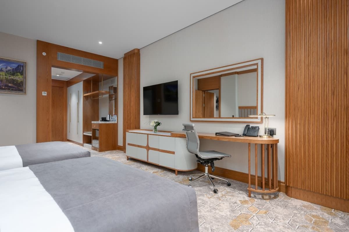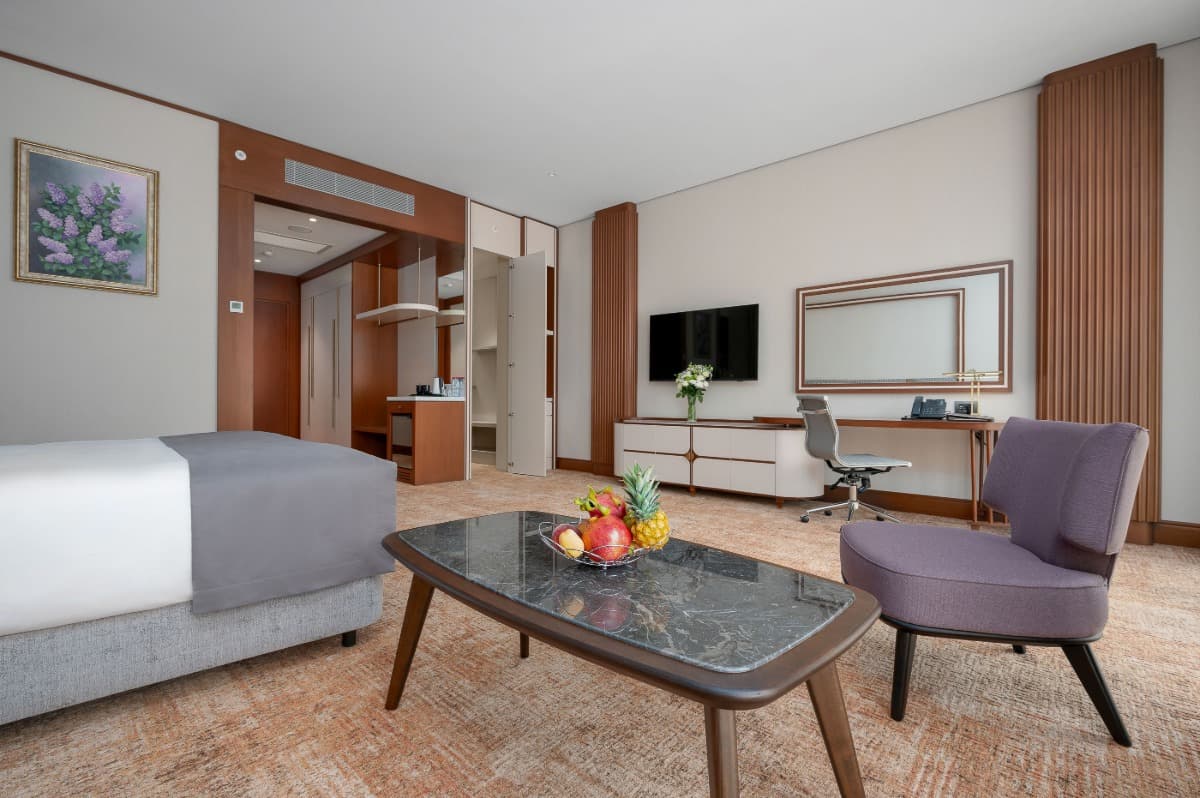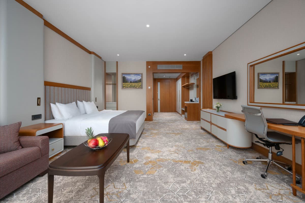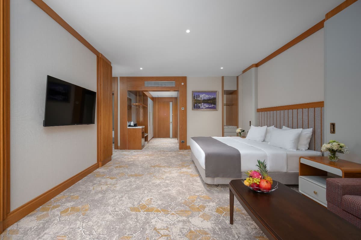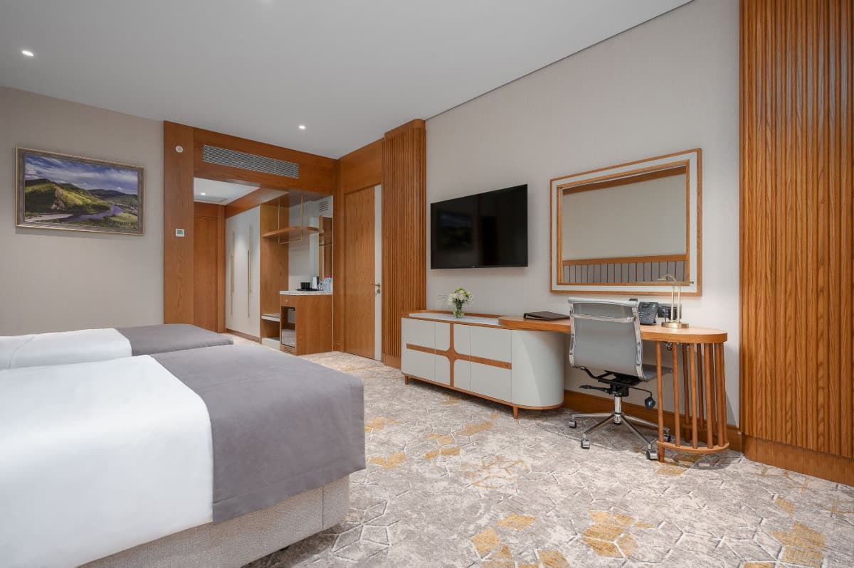 В каждом номере установлена система контроля климата, имеются чайно-кофейные наборы, фен, банные принадлежности, гостевая парфюмерия, халат и тапочки.