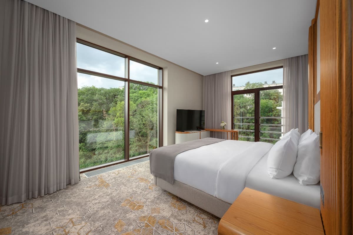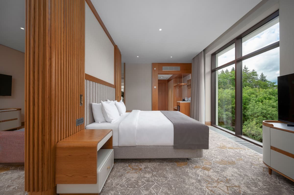 Комфортное размещение: удобные кровати с ортопедическими матрасами, панорамные окна с видом на лес