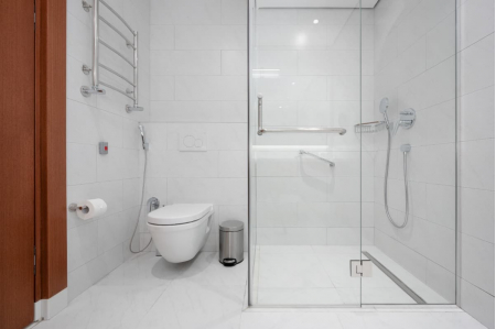 Санузел: с душевой кабиной, тапочки, туалетные принадлежности, фен, халат.