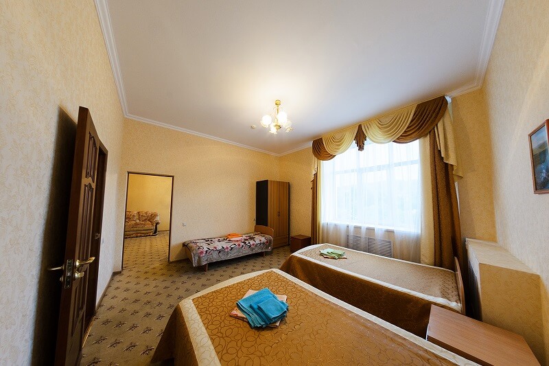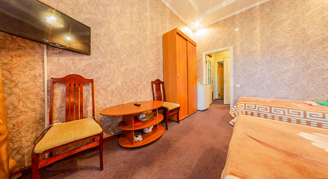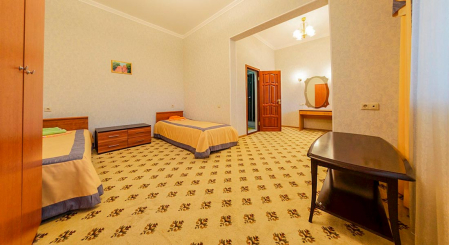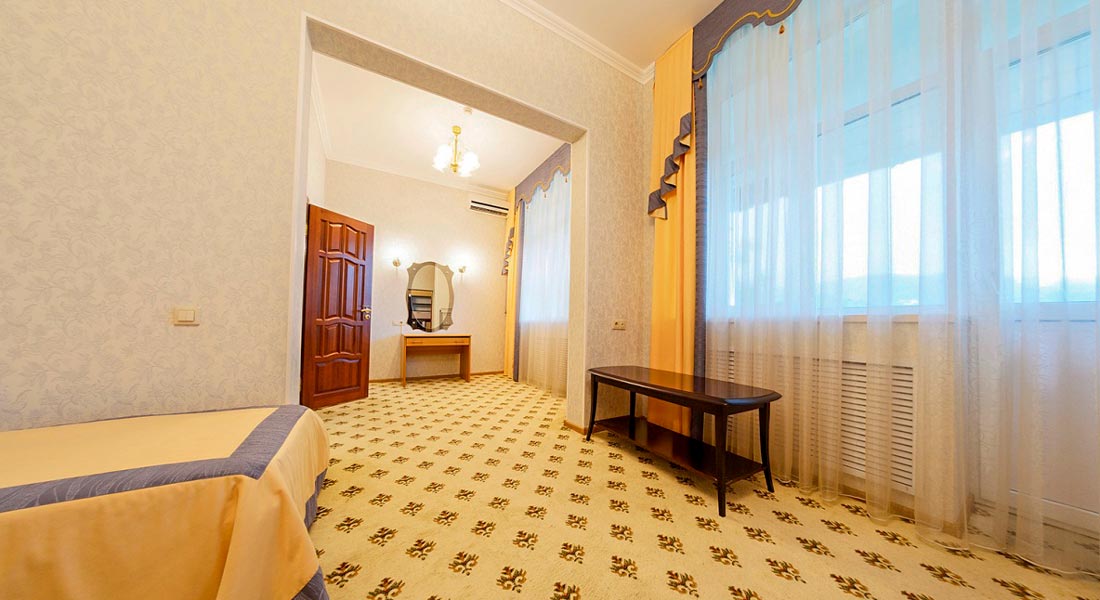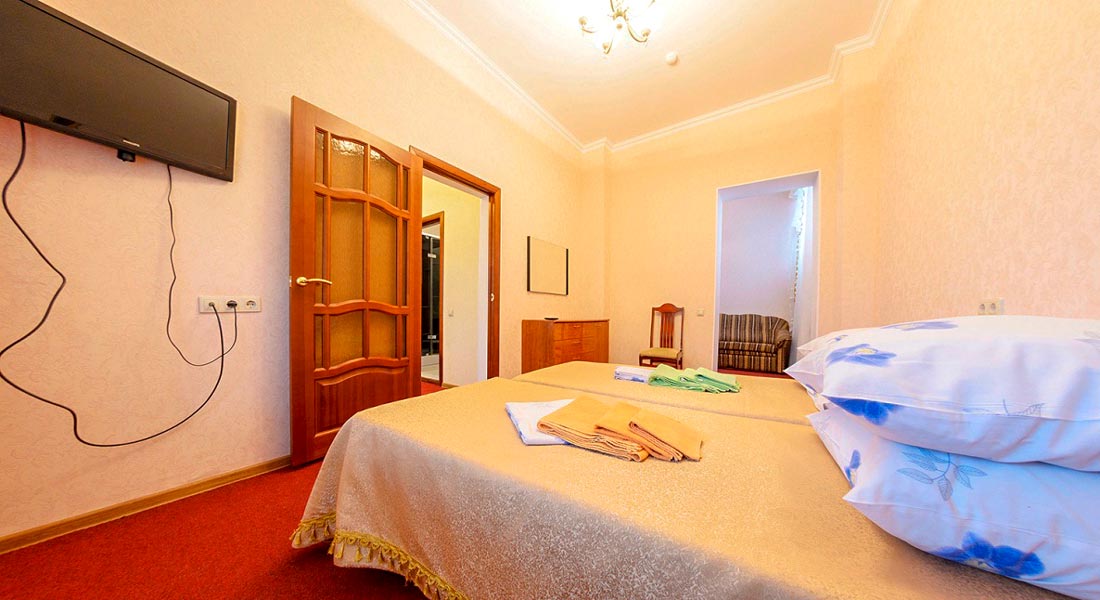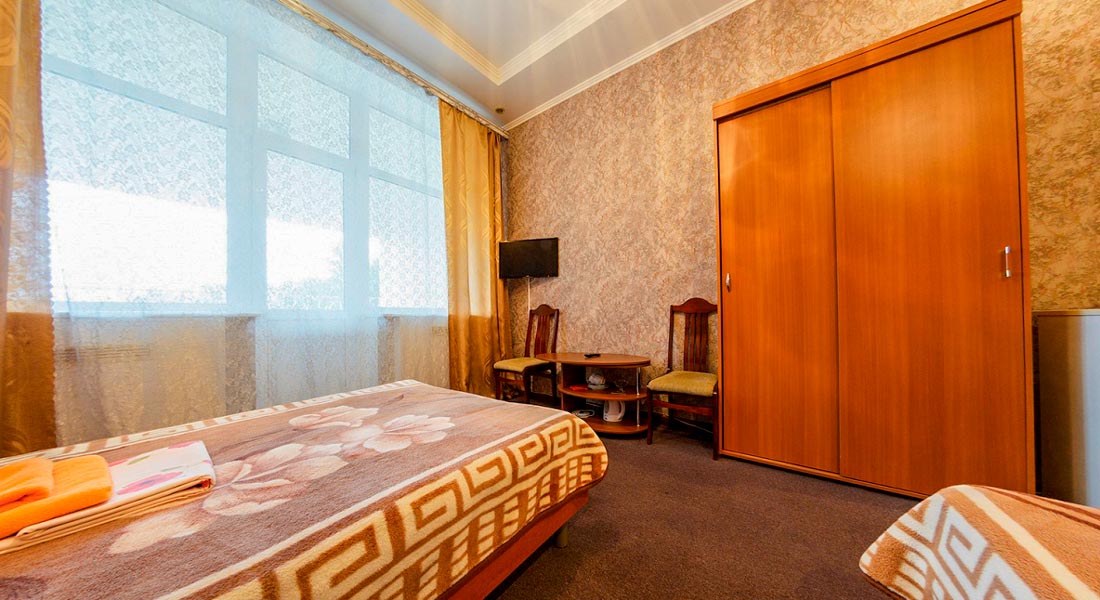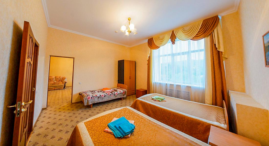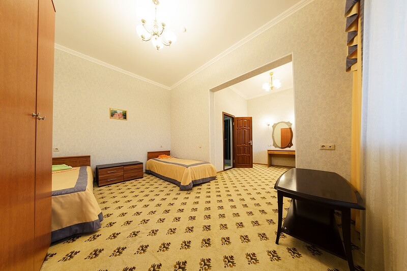 Номера санатория «Кавказ» — это стандартные 1-2х местные и улучшенные — 2-3х комнатные. Интерьеры и оснащенность номеров скромные. При этом все необходимое есть. Мебель, бытовая техника и сантехника не новые, но в рабочем состоянии. Номера в новом корпусе санатория с балконами.