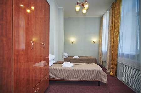 Мебель: Шкаф, две прикроватные тумбочки, два стула, две раздельные односпальные кровати.