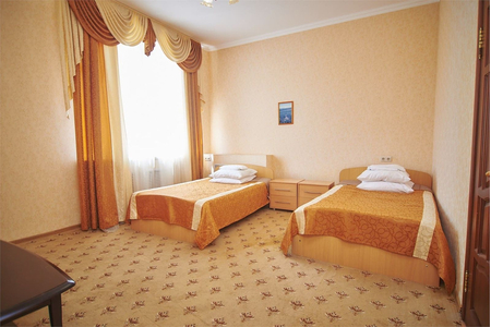 Мебель: Шкаф, прикроватные тумбочки, стулья, две раздельные односпальные кровати.