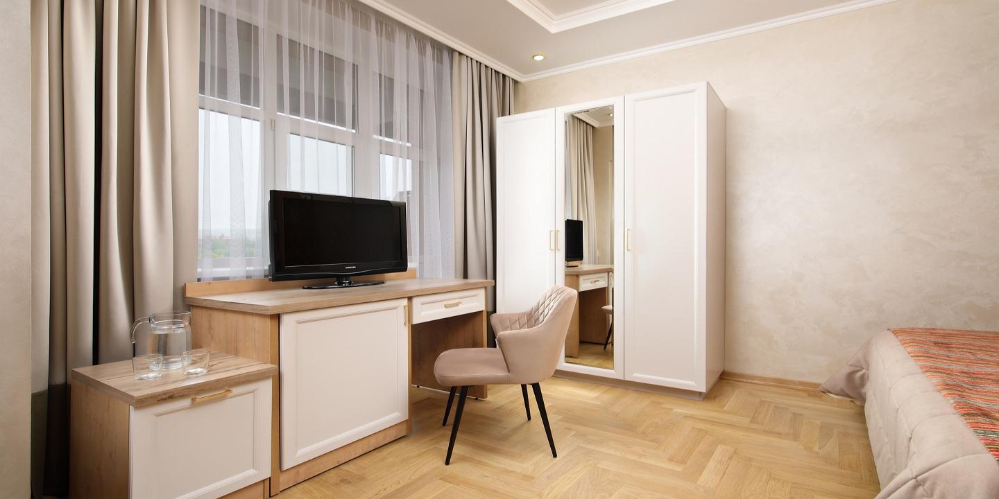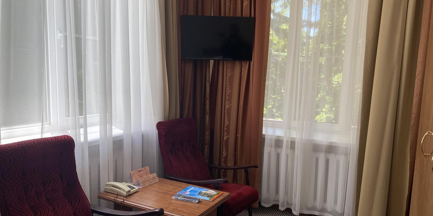 Оборудование: гладильная доска, кондиционер, мини-холодильник, сейф, телевизор, телефон, чайный набор посуды, электрочайник.