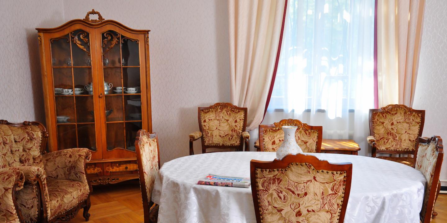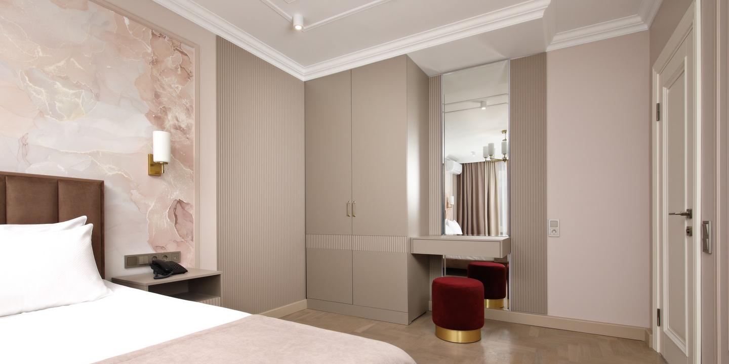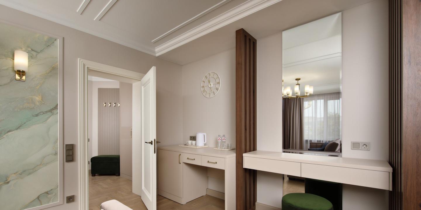Мебель: вешалка, диван раскладной, зеркало, кресла, кровати односпальные, прикроватные тумбочки, столик журнальный, столик туалетный, тумба, шкаф.