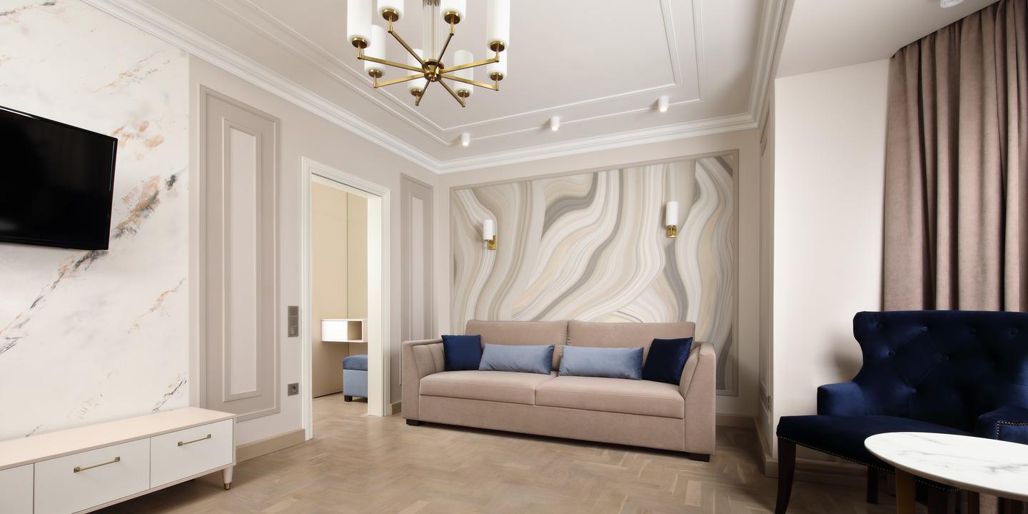 Мебель: вешалка, диван раскладной, зеркало, кресла, кровать двуспальная, прикроватные тумбочки, столик журнальный, столик туалетный, стулья, шкаф.