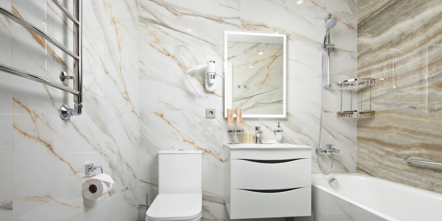 Санузел: с ванной, тапочки, туалетные принадлежности, фен, халат.