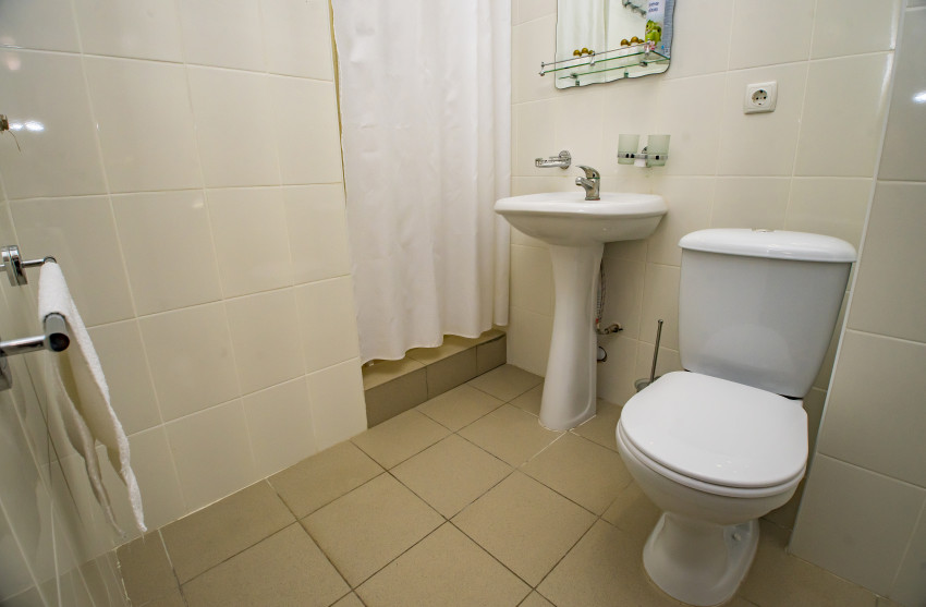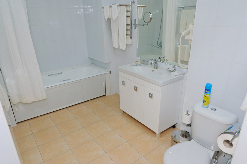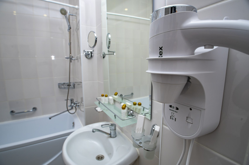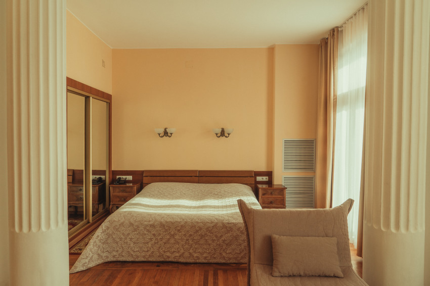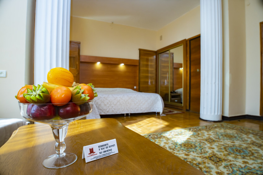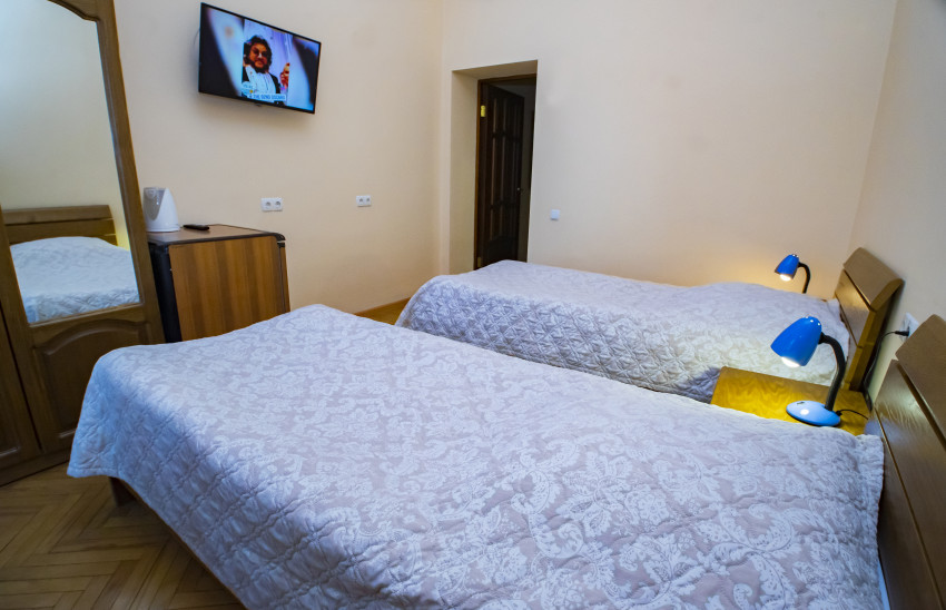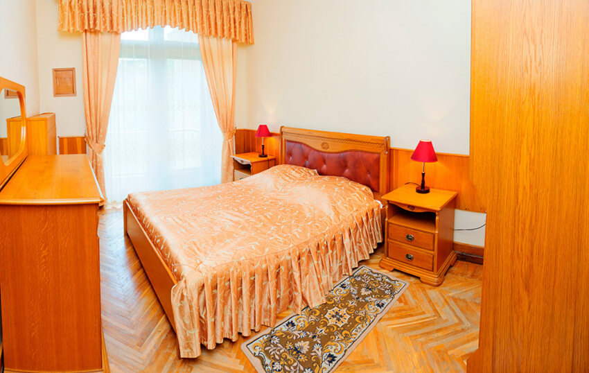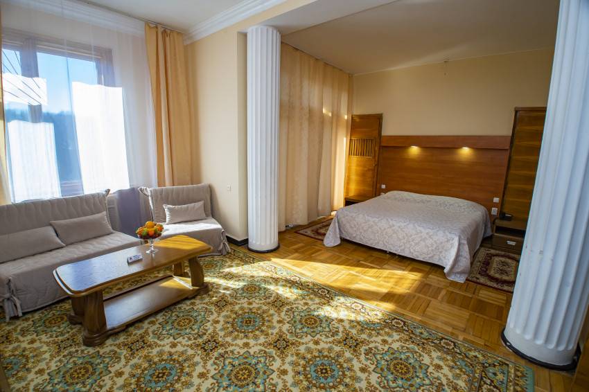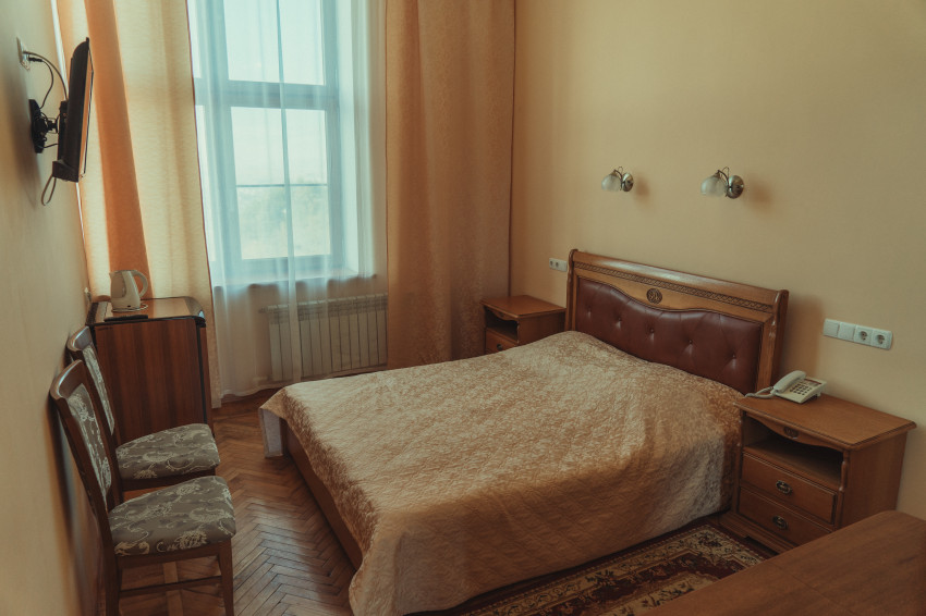 Заселение быстрое, сразу спросили фамилию по брони. Номера после свежего ремонта, уютные, в приятном классическом стиле, всё чисто. Есть холодильник, фен, телевизор с 20 каналами. При заезде предупредили про ремонт фасада. Уборка каждый день, бельё меняют раз в пять дней. Вид с балкона просто завораживает, открывается Эльбрус, горы такие огромные, что дух захватывает.