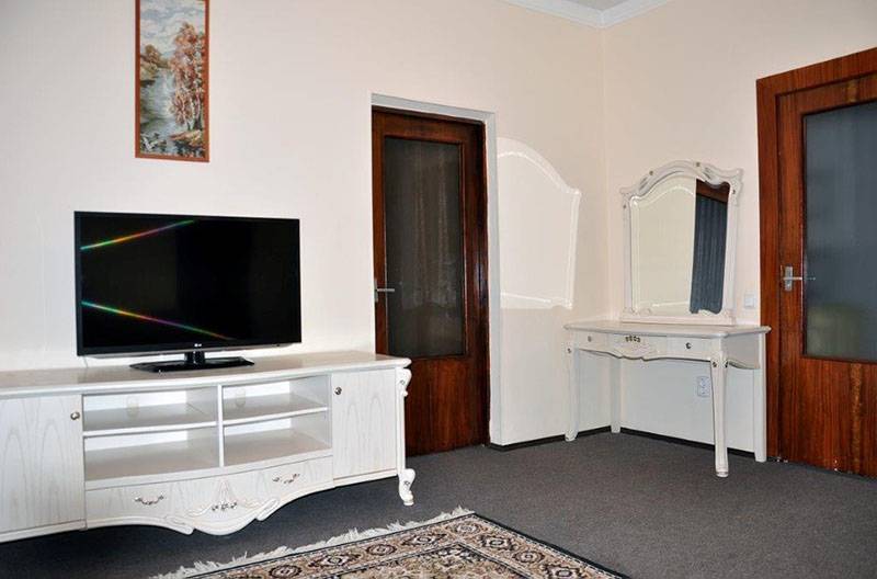 Пансионат маленький, около 30 номеров, свое кафе, номера у нас были 2х комнатные с высокими потолками и большими окнами, отдельным санузлом. Большой хороший телевизор, удобные кровать(мягкий матрас) и жёсткий диван.