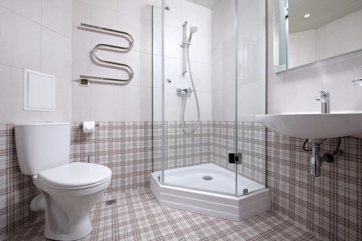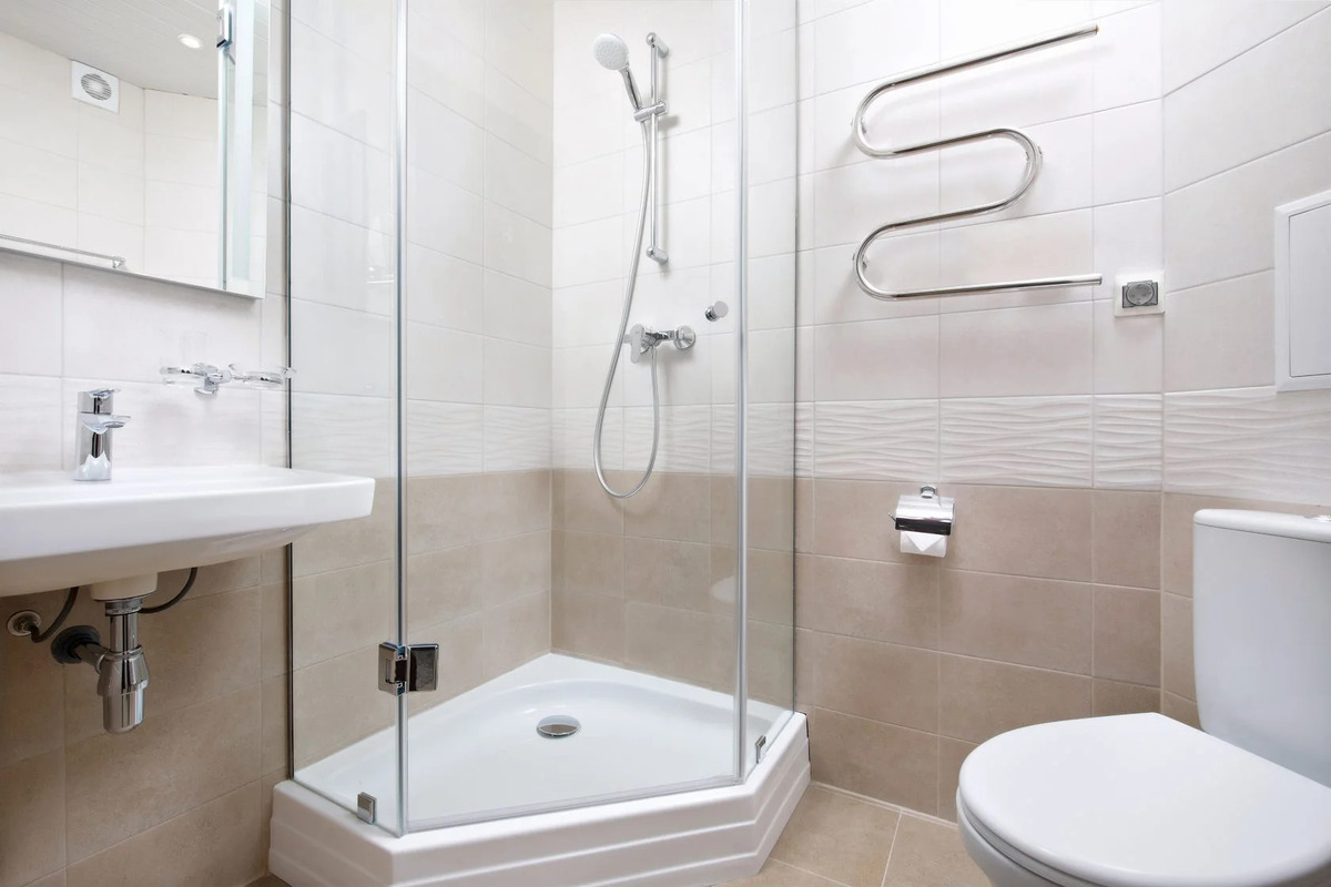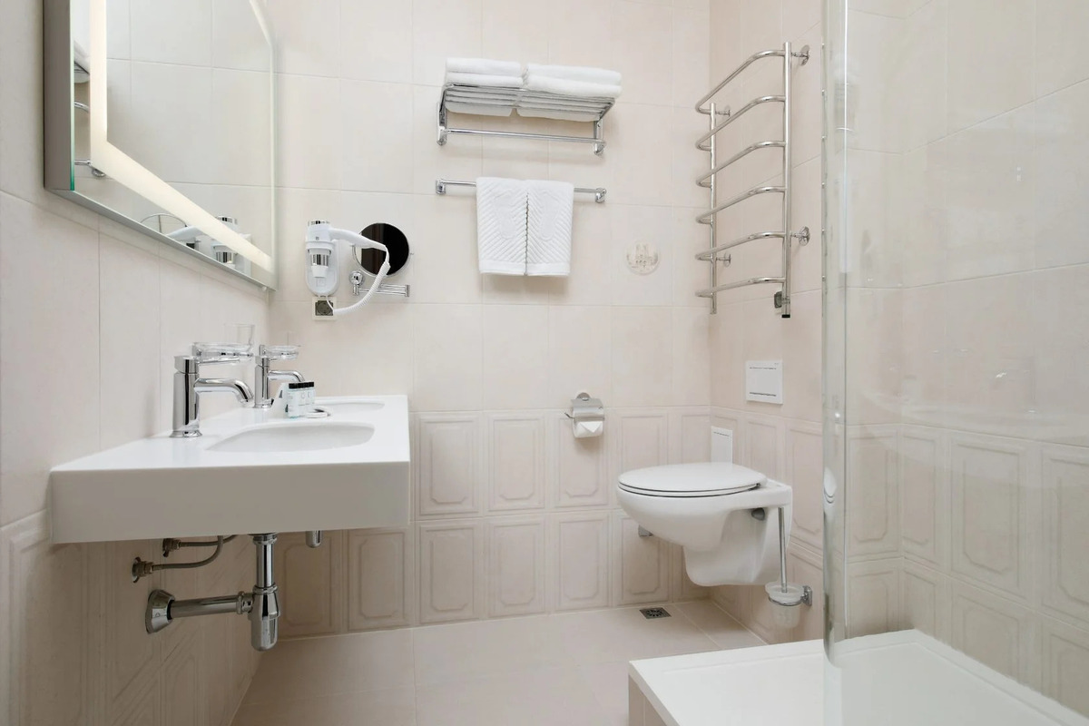 Санузел: с душевой кабиной, туалетные принадлежности, фен.