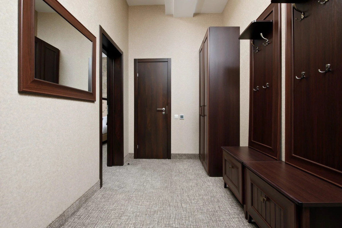 Мебель: вешалка, зеркало, кровати односпальные /одна двуспальная кровать, прикроватные тумбочки, стол, стул, шкаф.
