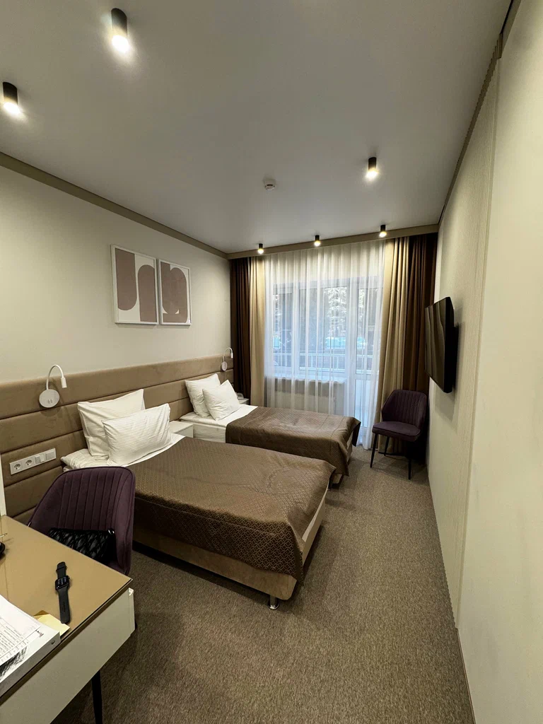 Провела в санатории четыре ночи в начале ноября, жила в номере Люкс Премиум на шестом этаже. Окна выходили и на проспект Ленина, и на уютный внутренний дворик — в комнате всегда было светло и солнечно. Номер идеально чистый, мебель и кровать в прекрасном состоянии, всё выглядит свежо. Соседи были только сверху и снизу, но я их совершенно не слышала, да и с улицы шума почти не доносилось — спокойно спала с открытым окном.