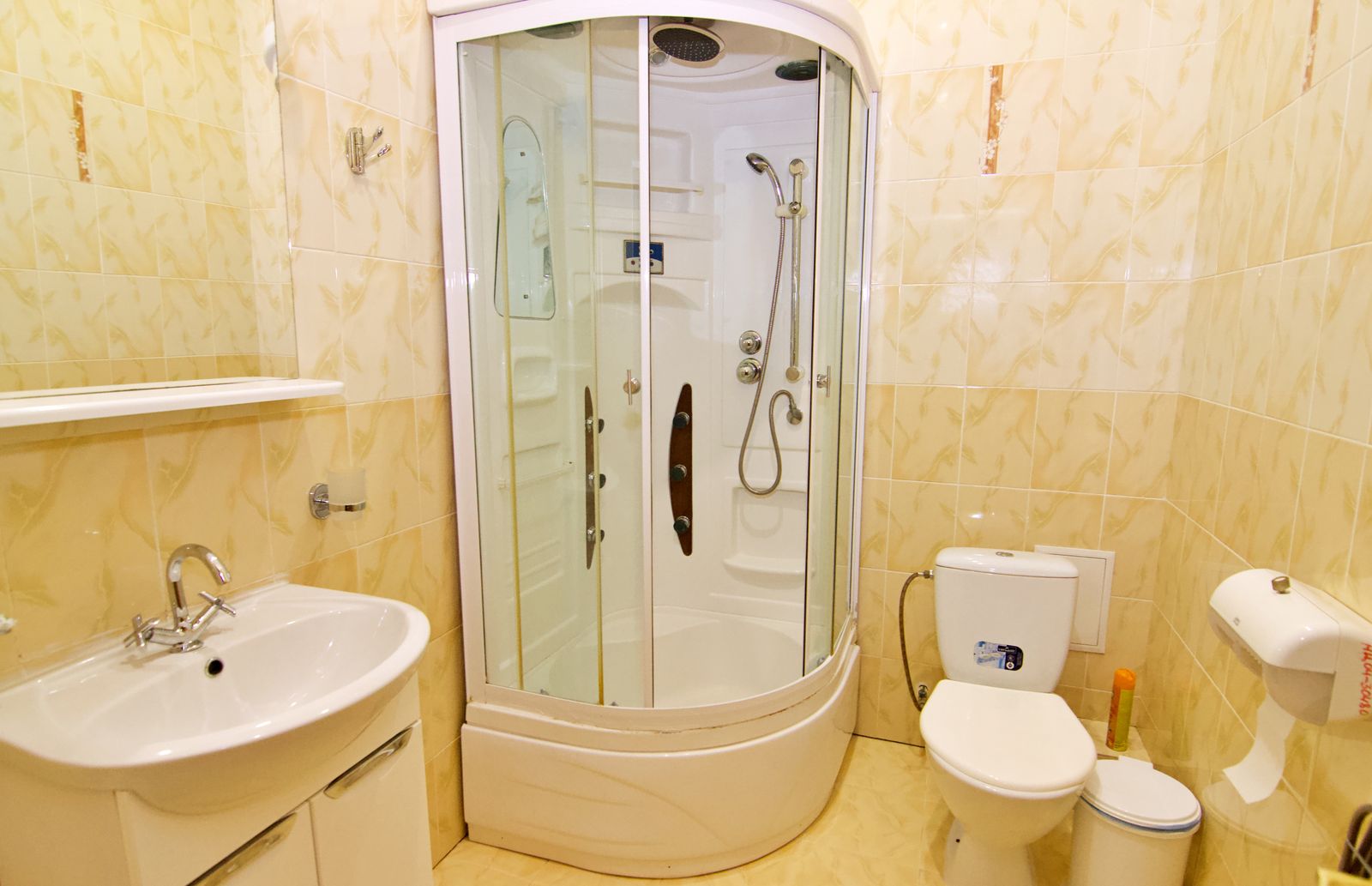 Санузел: с душевой кабиной, туалетные принадлежности, фен.