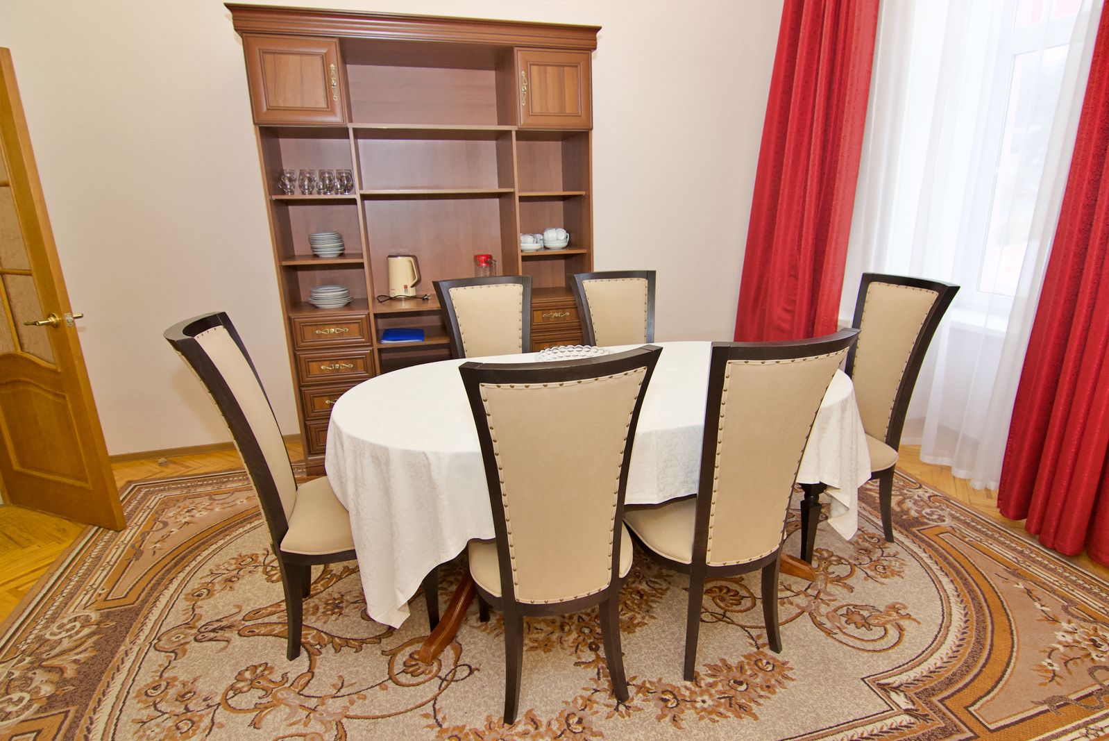 Мебель: зеркало, кровать двуспальная, набор мягкой мебели, прикроватные тумбочки, стол, стулья, шкаф, шкаф для посуды.