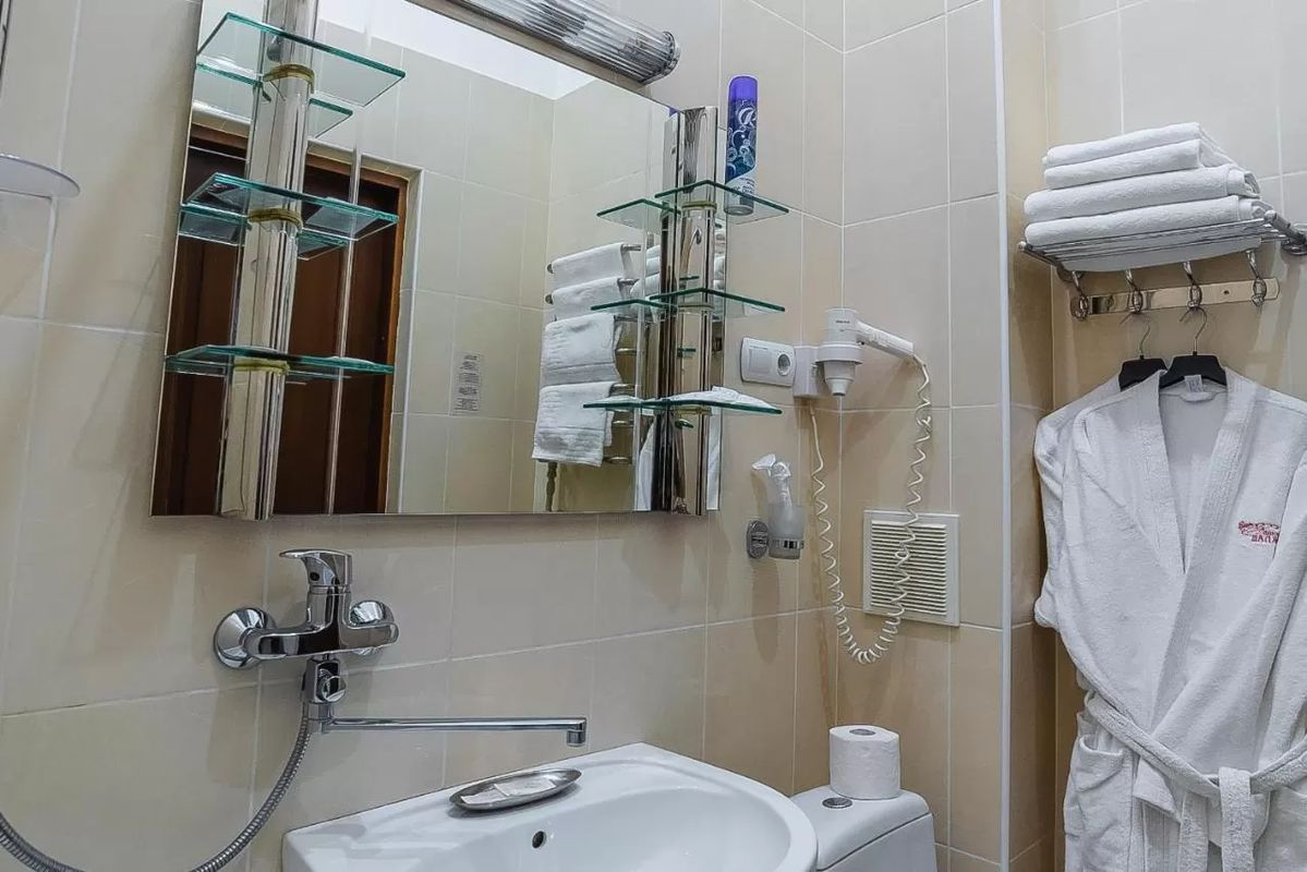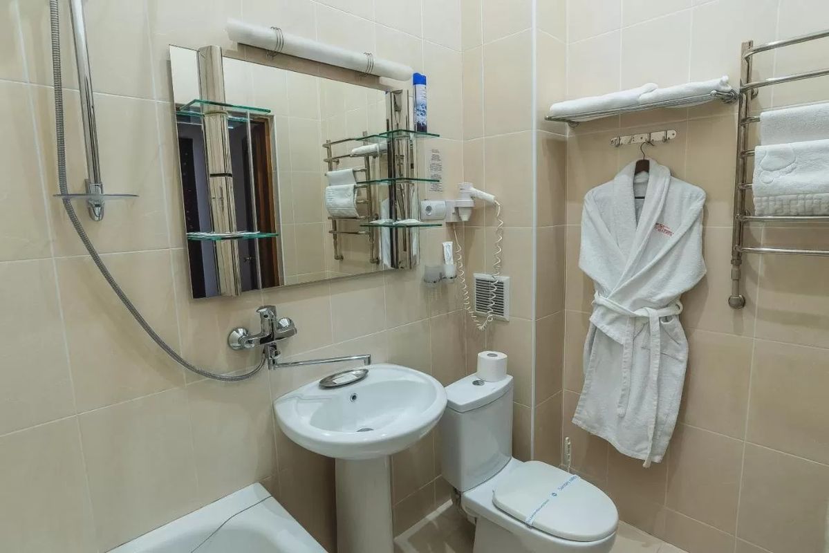 Санузел: с душем, тапочки, туалетные принадлежности, фен, халат.
