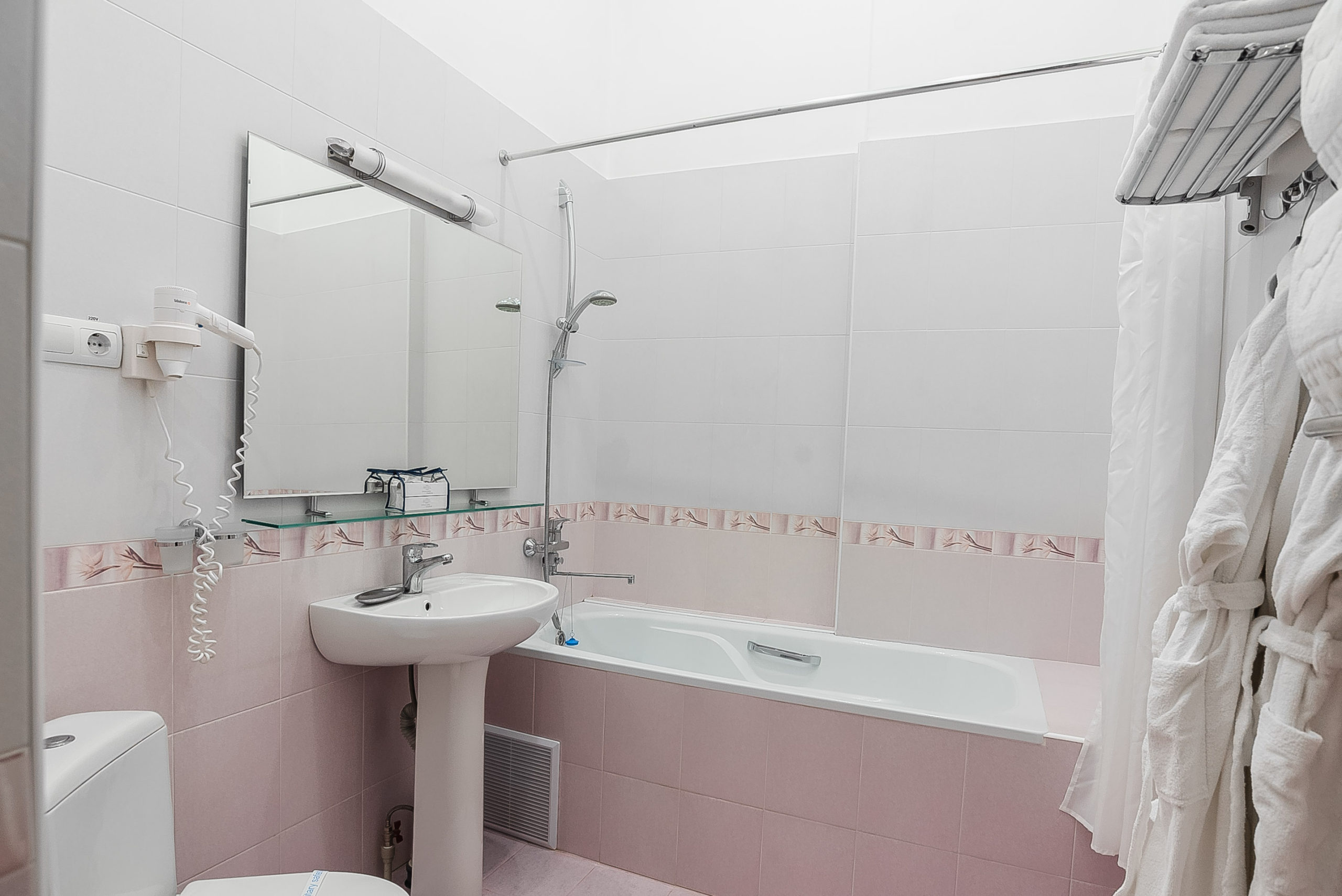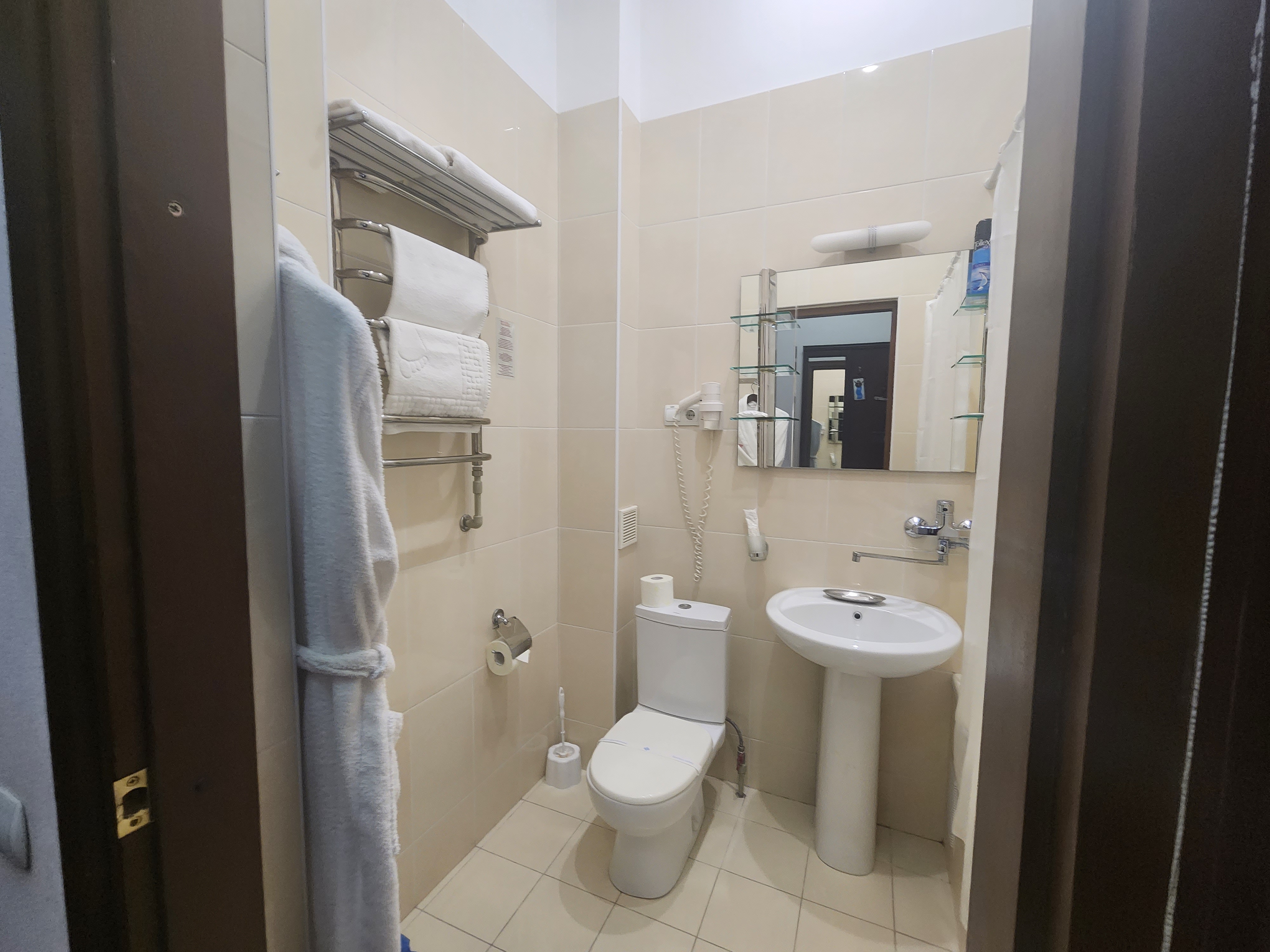 Санузел: с душем, тапочки, туалетные принадлежности, фен, халат.