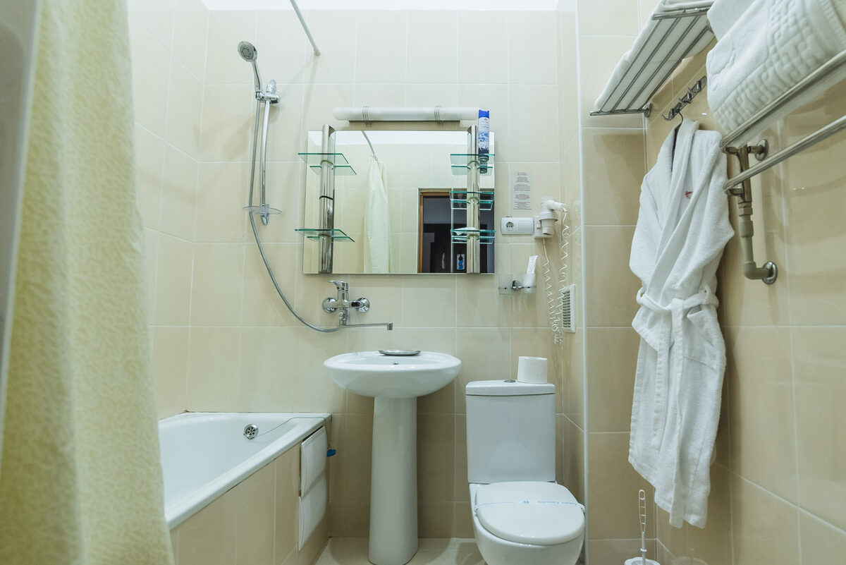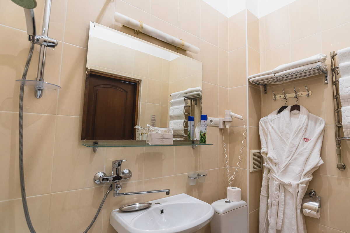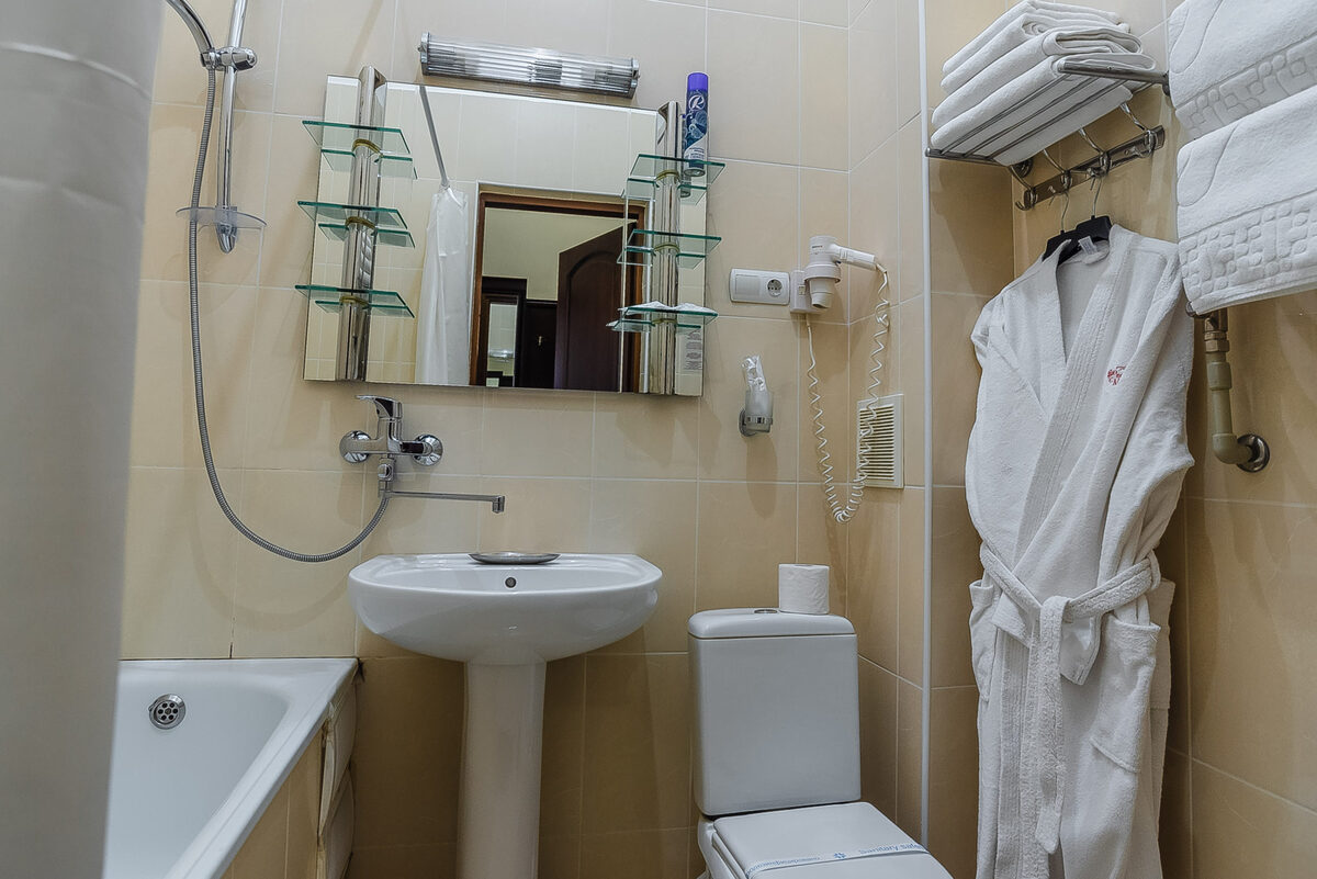 Санузел: с душем, тапочки, туалетные принадлежности, фен, халат.