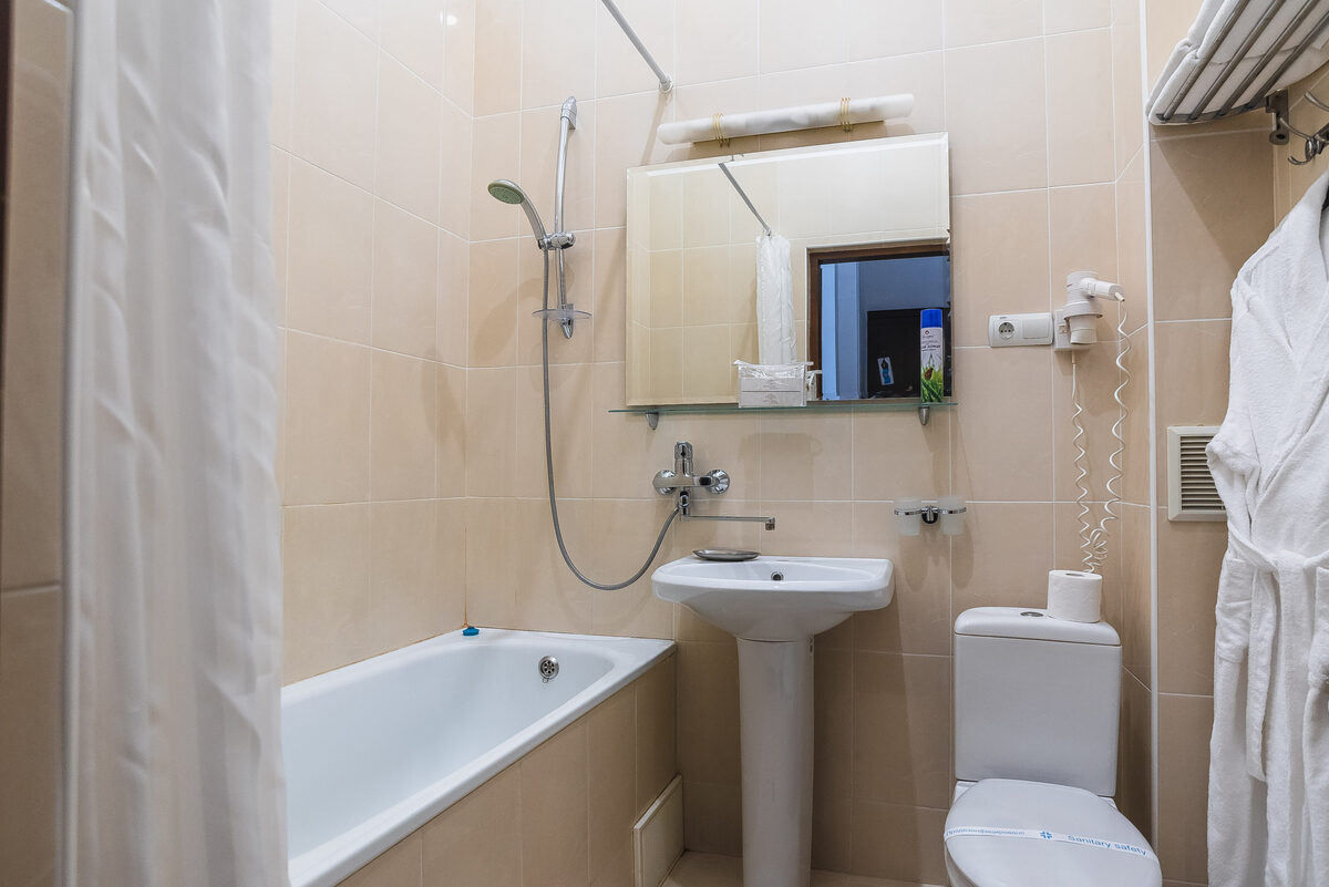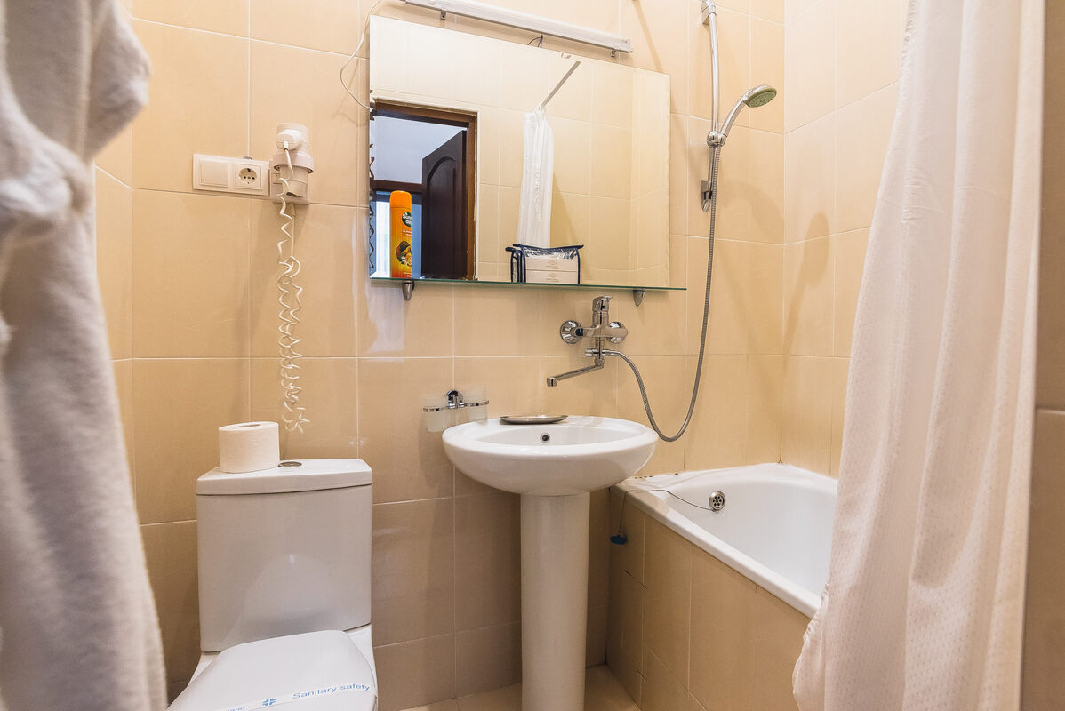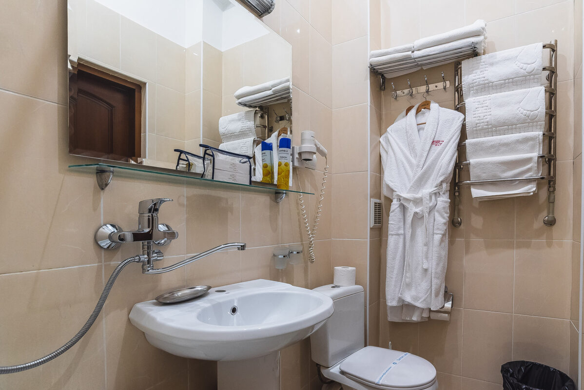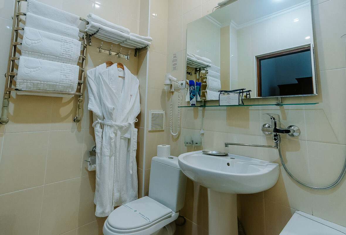 Санузел: с душем, тапочки, туалетные принадлежности, фен, халат.