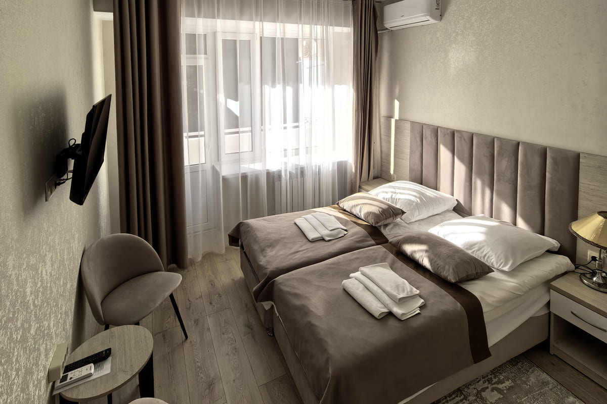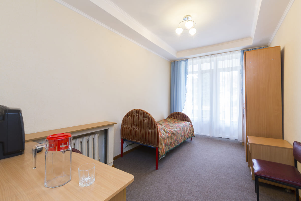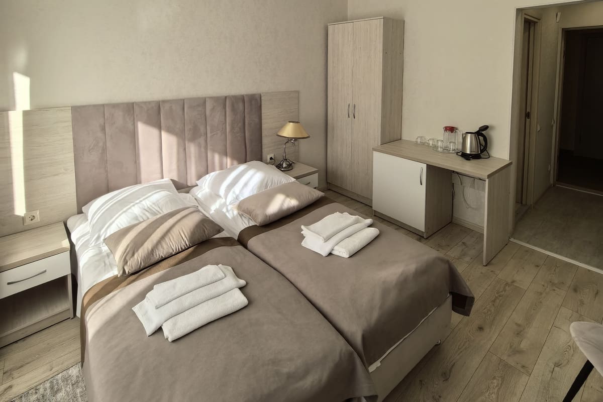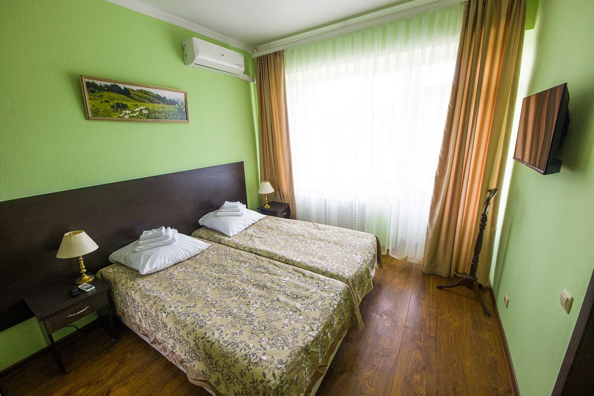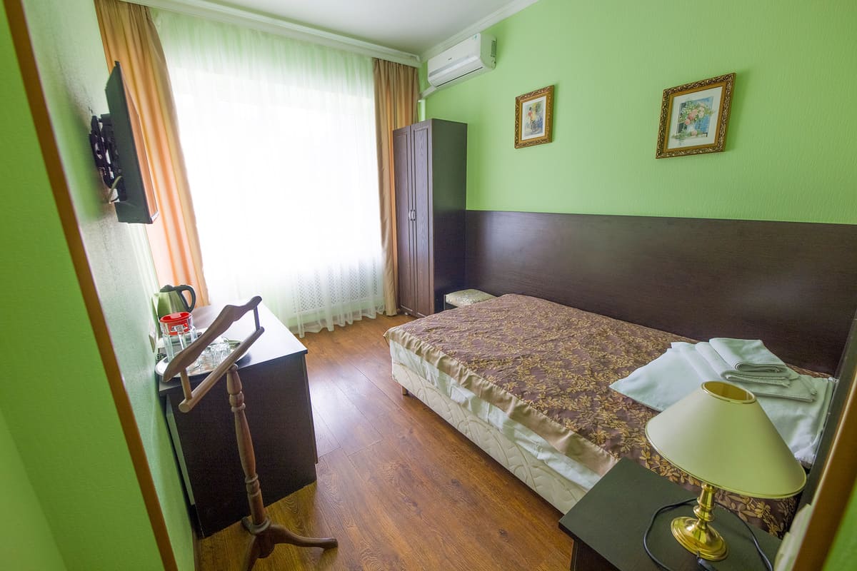 Сервис: Ежедневная уборка номера, смена полотенец и постельного белья 1 раз в 5 дней.