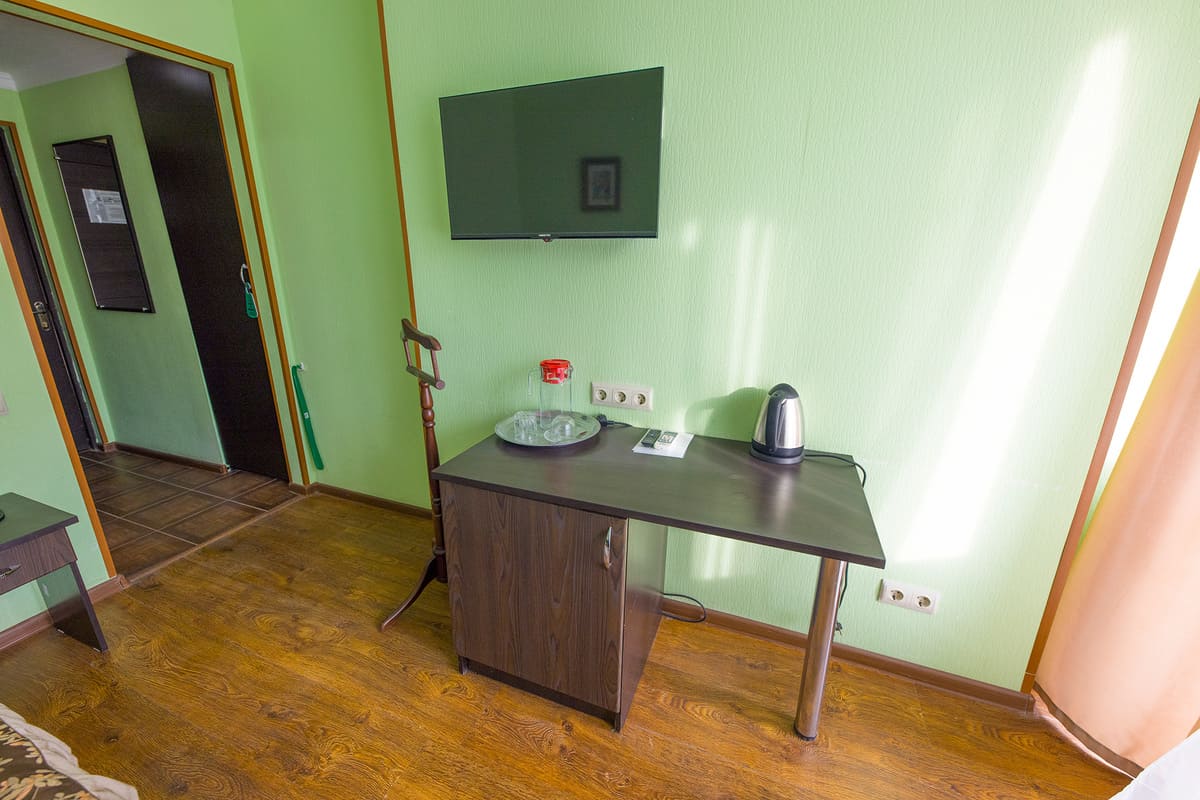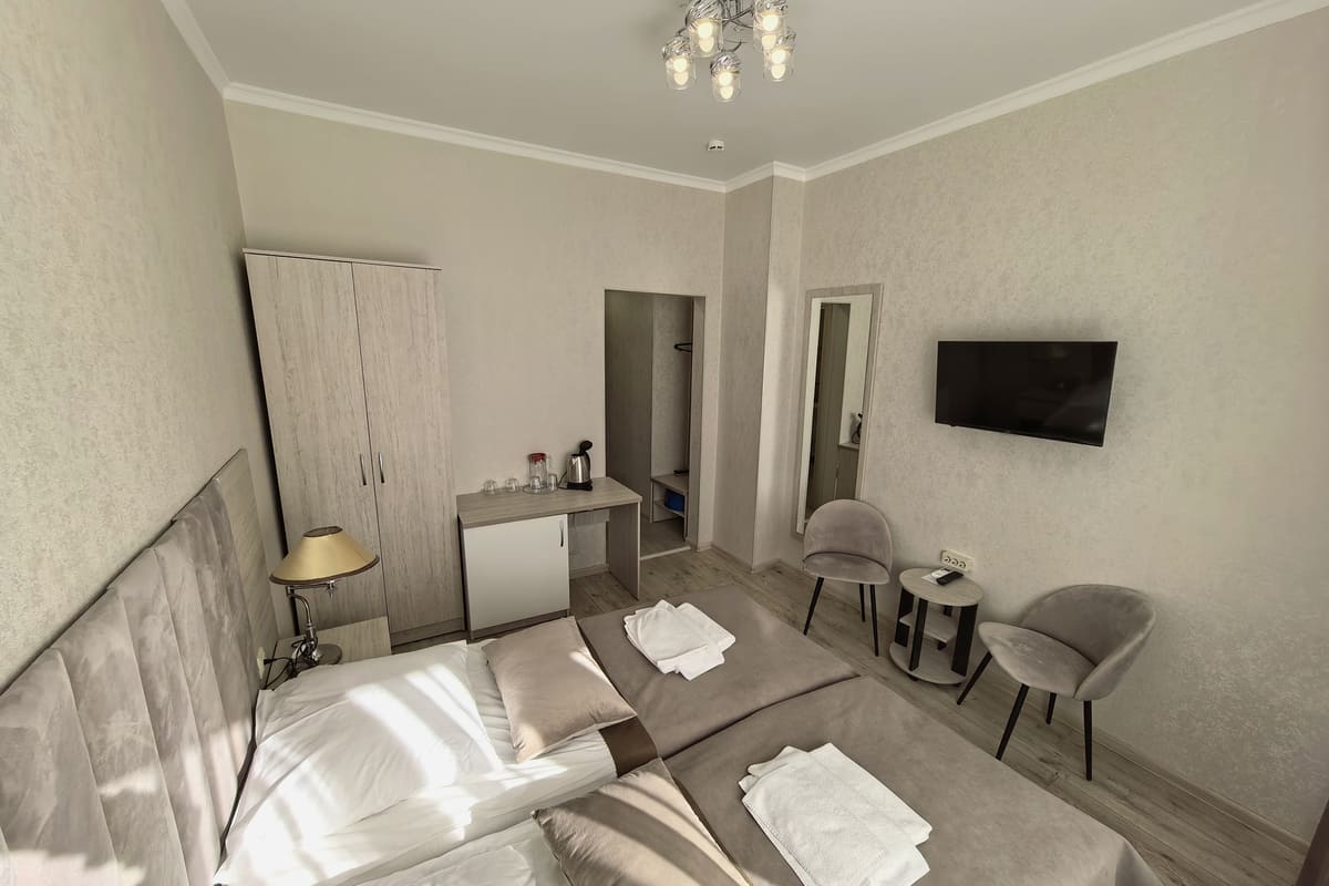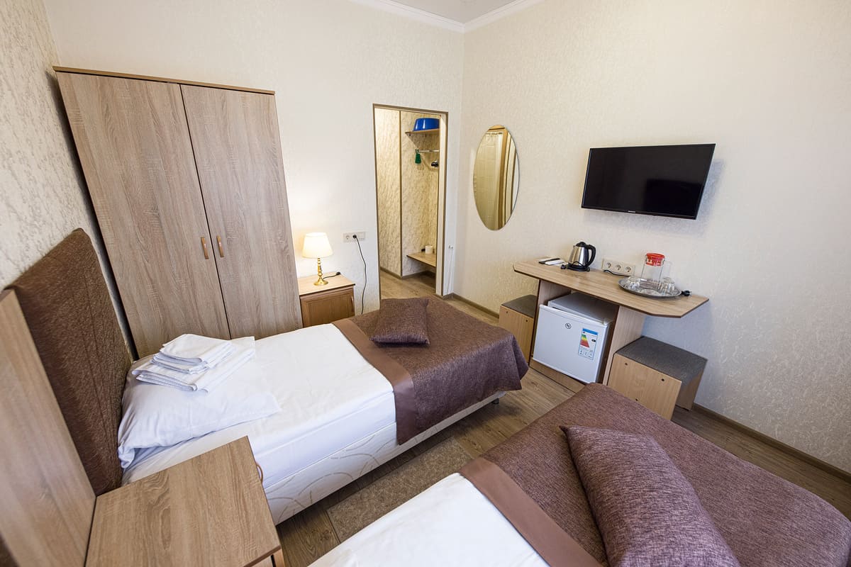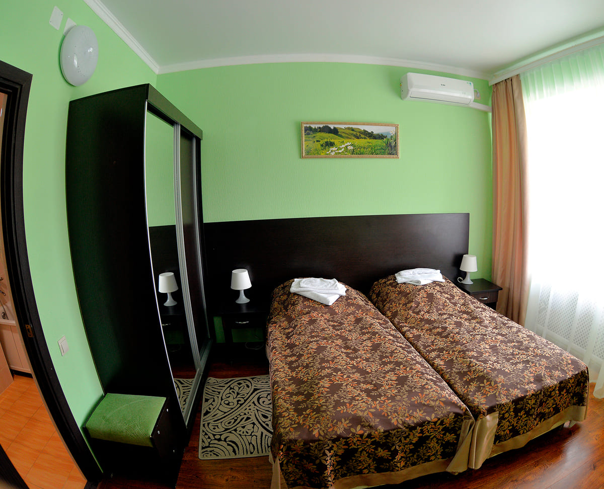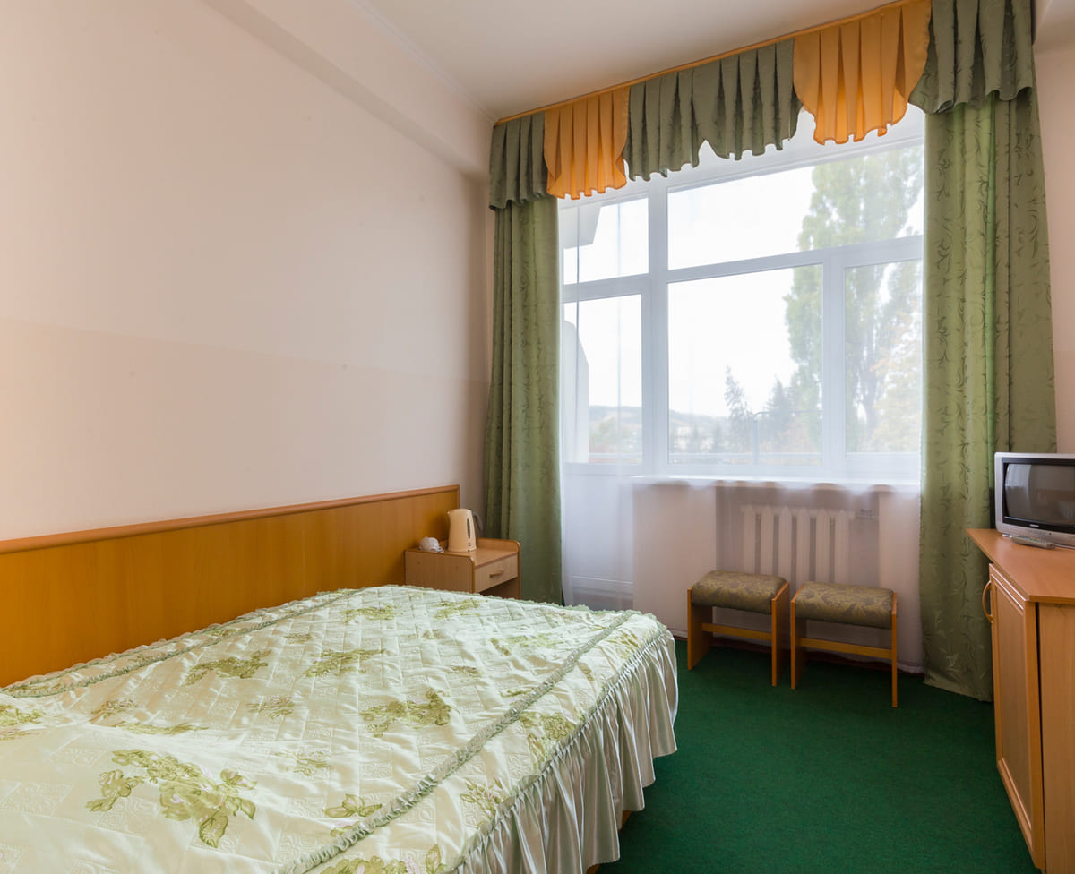 Сервис: Ежедневная уборка номера, смена полотенец и постельного белья 1 раз в 5 дней.