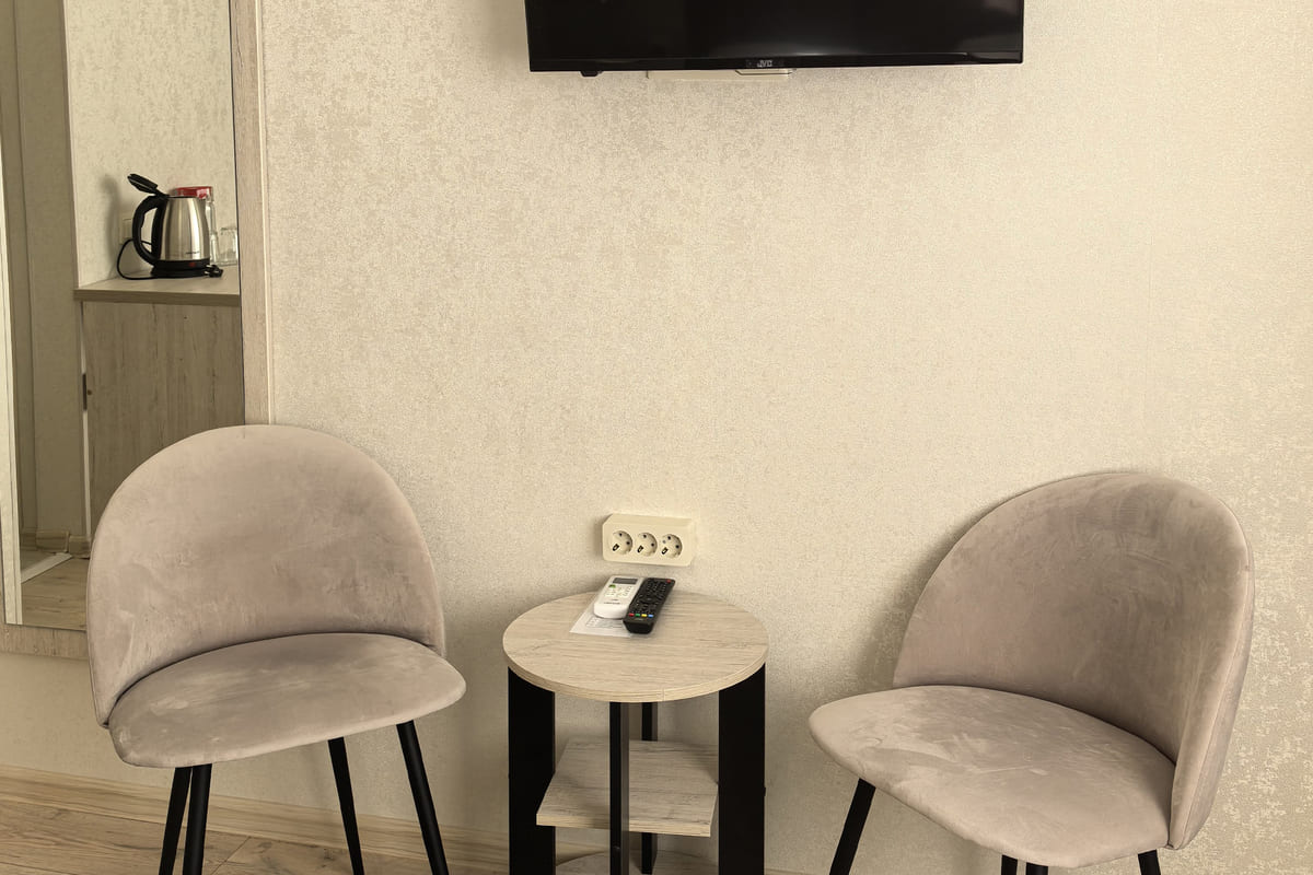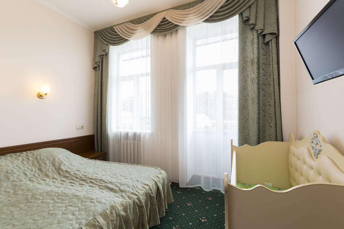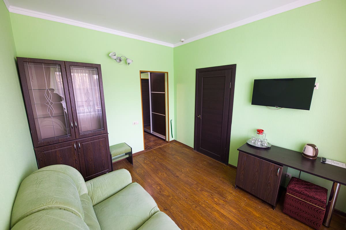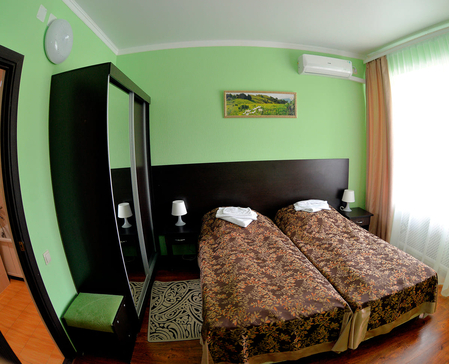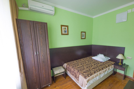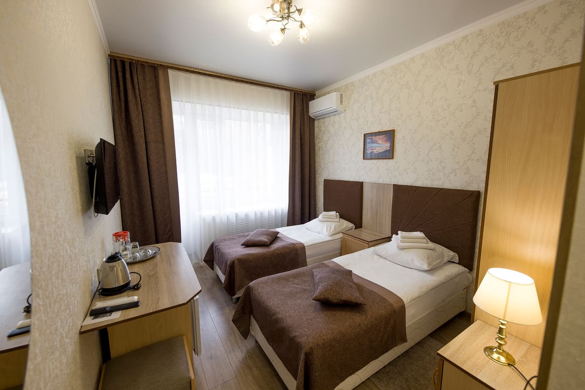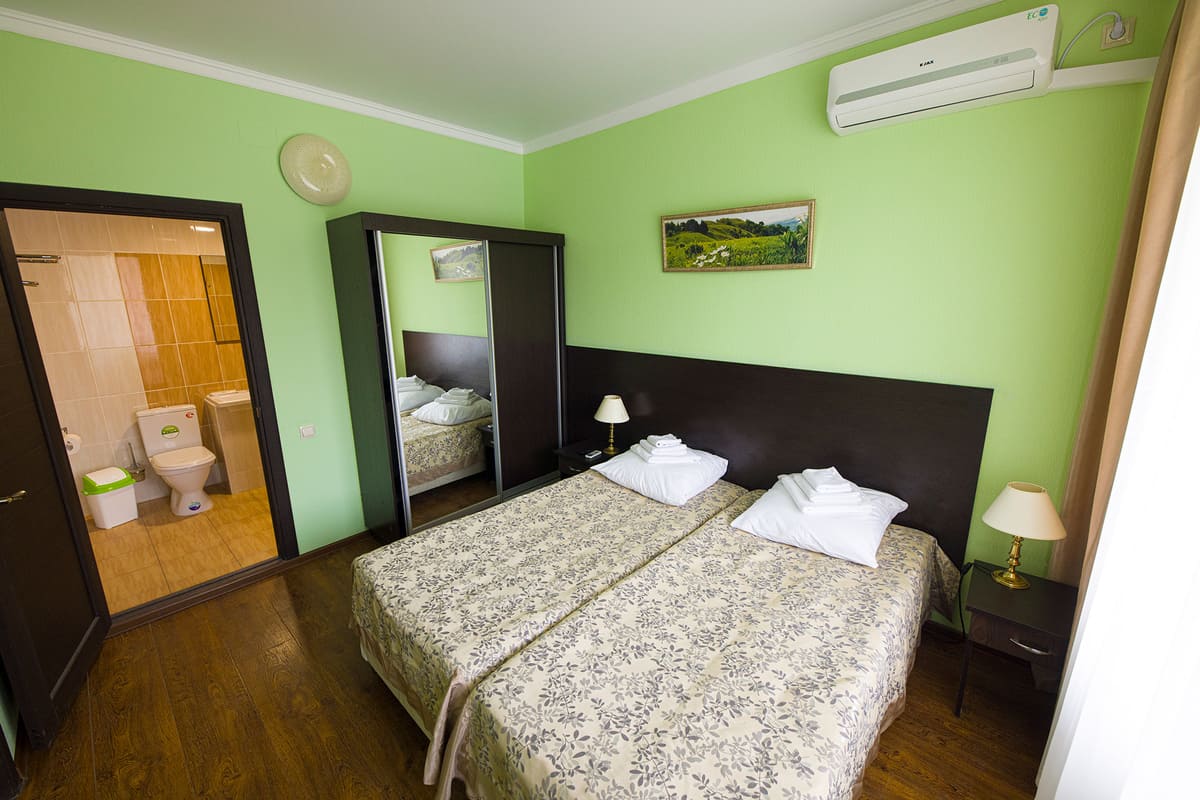 Сервис: Ежедневная уборка номера, смена полотенец и постельного белья 1 раз в 5 дней.