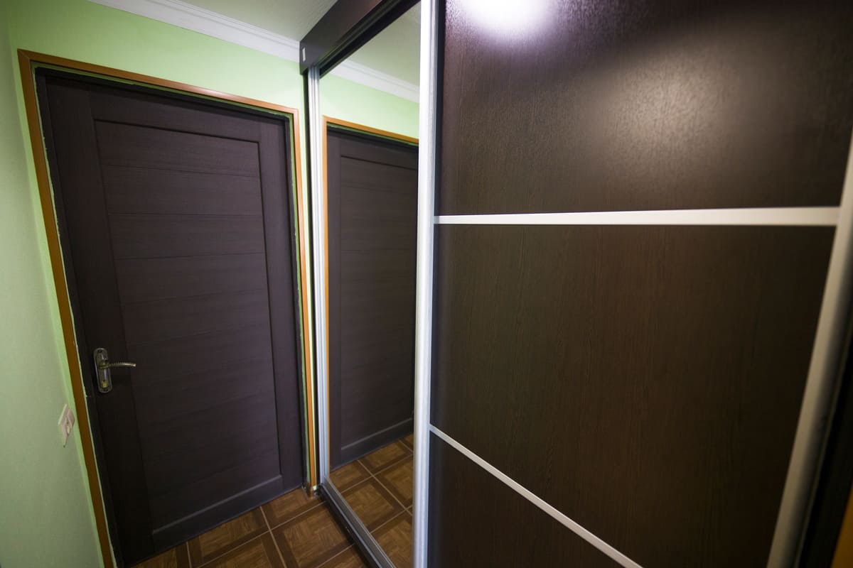 Мебель: вешалка, диван, зеркало, кровать двуспальная, прикроватные тумбочки, стол, стул, шкаф.