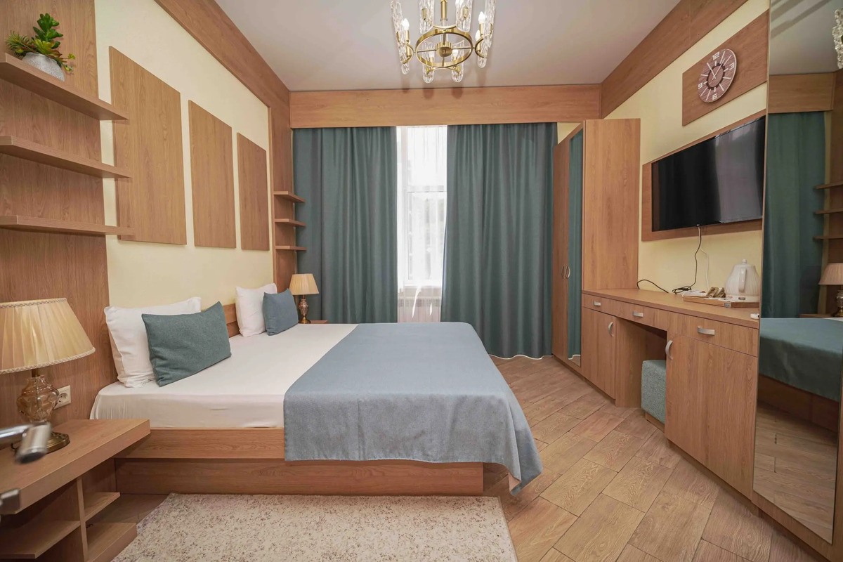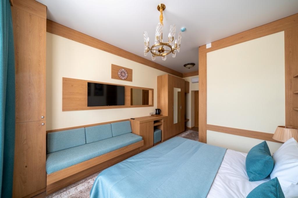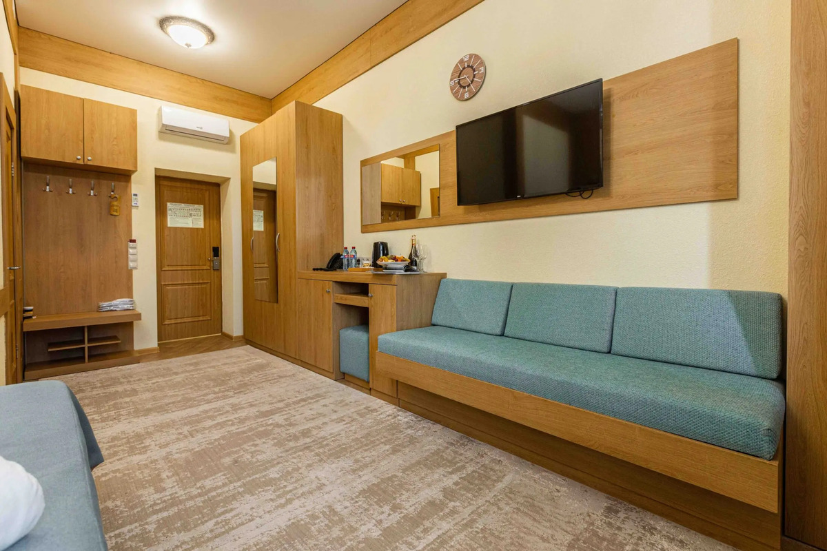 Отдыхали втроем (с мужем и родственницей). Разместились в люкс номерах 351 и 353. Почитали на сайте о новом Премиум отеле, но все оказалось не так радужно. В душе крючки были сломаны и не было полочки. В номере-люкс был чай, кофе и чайник с водой, но не было даже ложек чайных( после просьбы принести нам ложки, через 2 дня, но это было такой проблемой. В лечебнице приходилось по часу ждать процедуру. Врач назначил процедуру, которой не оказалось. Медсестры не подготовлены. Пришлось через три дня отказаться от лечения. Пообщались с главной сестрой, адекватная сестра, извинилась, но к сожалению от нее мало что зависит. На сайте заявлено, что в отеле есть спортивный зал (но оказалось что есть только помещение под зал, но его даже не начинали оборудовать. Хотя его никто не видел. В бассейне заявлены противотоки, джакузи и водяные горки, но кроме горок( и то их нужно было просить чтобы включили). Было очень скользко, коврик занимал только 20%. Никто не убирал воду. На мою просьбу, чтобы убрали воду, мне ответили — А вы ходите в тапках. Душевые кабины и туалет, это просто УЖАС. Даже писать не буду.