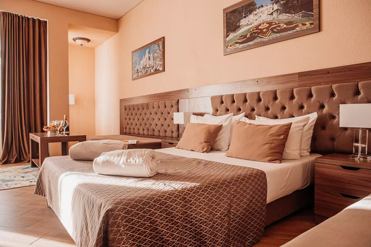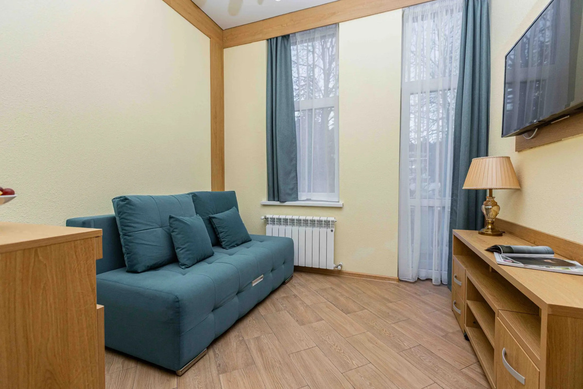 Отдыхаем с 20.10 по 04.11. Я не понимаю откуда взялись 5 звёзд, даже 3 с большой натяжкой. Начнём с порога - санаторий весь в строительных работах, т.е. из всех номеров первого этажа вид на ремонт. Т.е. людей заселили в стройвариант. Внутри воняет мокрой штукатуркой практически везде. При том, что он ещё в ремонте везде отваливается и трескается плитка. Персонал за редким исключением пугает своей недружелюбностью (могу выделить только оду женщину на ресепшине и охранника, вот им бы быть управляющими, только благодаря им решались быстро и вежливо какие-то вопросы). Уборка номера - это вынос мусора, ни чайные наборы, ни косметика ничего не пополняется, ложек нет, я конечно мою за собой чашку, но если забыла, то там она и стояла грязная, зеркала не протирали ни разу, полы убрали после того как повесила табличку, Полотенца не меняли, халаты тоже, пастель сменили на 8 день, когда сама попросила это сделать. Ресторан - отдельная тема, закуски одинаковые на завтрак, обед и ужин в течении всего времени. Ассортимент остальных блюд небольшой, ужины вкусные, обеды тоже, завтраки терпимые, но все это никак не санаторная еда. Всё оооочень жирное, много жареной еда, а пареной и варёной чуть и всегда одна и та же. В холодильнике вместе с кефиром стоит пиво, на ужин вино. Кофе пить невозможно. Вкусный чай, который ты сам можешь заварить в чайниках. Посадка в ресторане свободная, скатерти никто не меняет, поэтому приходится выбирать наименее грязный стол. Функционального персонала типа официантов и горничных явно крайне мало, зато куча непонятных соглядатых, которые по два-три человека стоят на входе в ресторане и в залах. Помещение спа зоны холодное, неуютное, бассейн хотелось бы немного теплее, хамам и сауны понравились, но тоже с недоделками. Души в раздевалках подубитые с грязными шторками. Кстати в номере также весит шторка в душевой, естественно не отличающаяся чистотой - напоминаю это номер делюкс в 5-тизвездочном премиум отеле. Слава богу взяли путёвку без лечения - бегали в др санатории. Шумоизоляция отвратительная. Везде расставлены пакеты с каким-то хламом. Ну не должны постояльцы 5, 4, да и 3 звезд видеть «грязное белье» отеля.