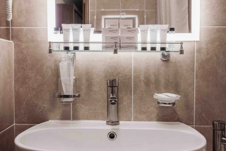 Санузел: с душем, тапочки, туалетные принадлежности, фен, халат.