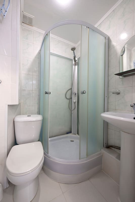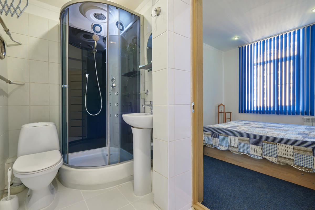 Санузел: с душевой кабиной, тапочки, туалетные принадлежности, фен.