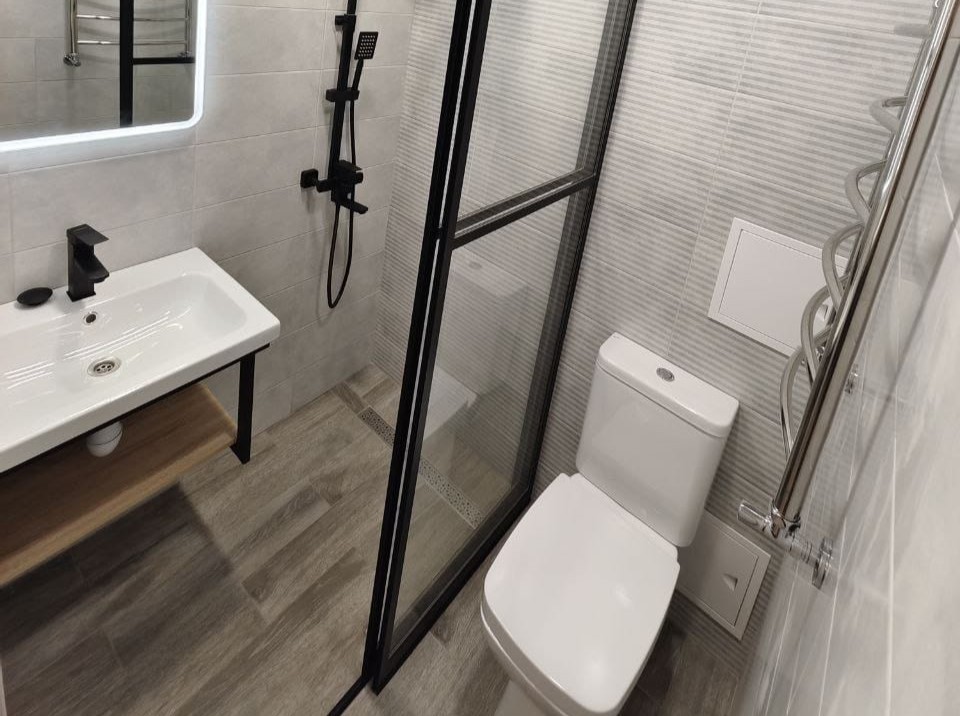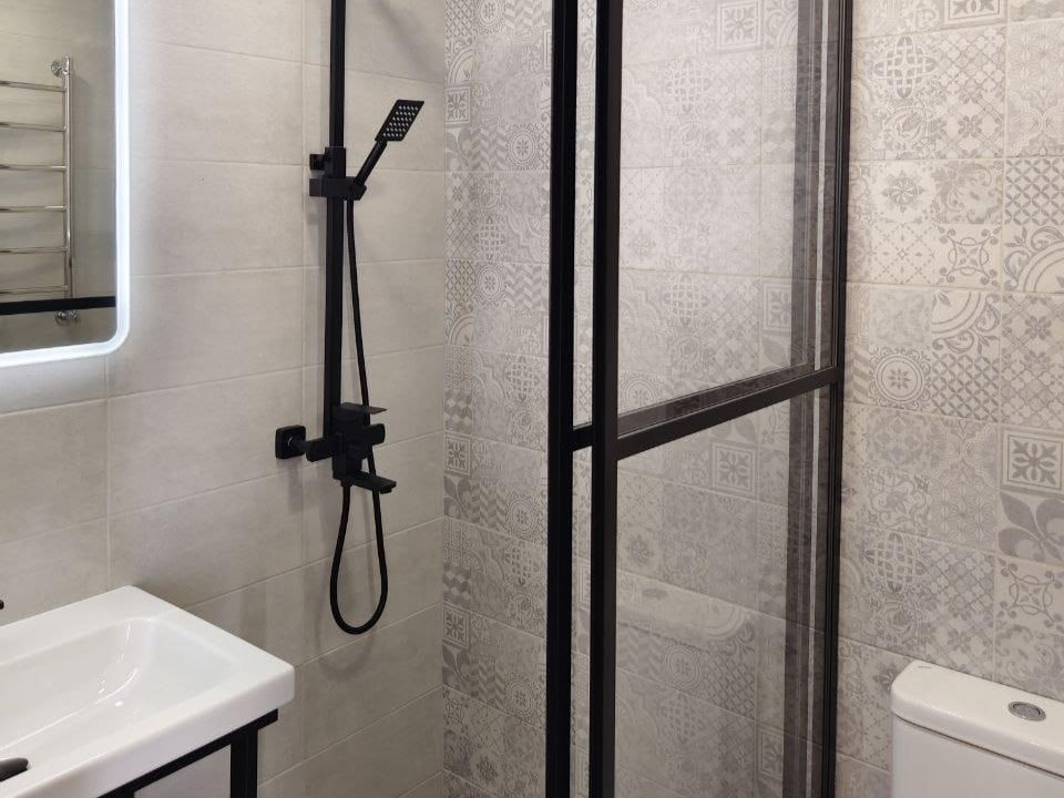Санузел: с душем, туалетные принадлежности, фен, халат.