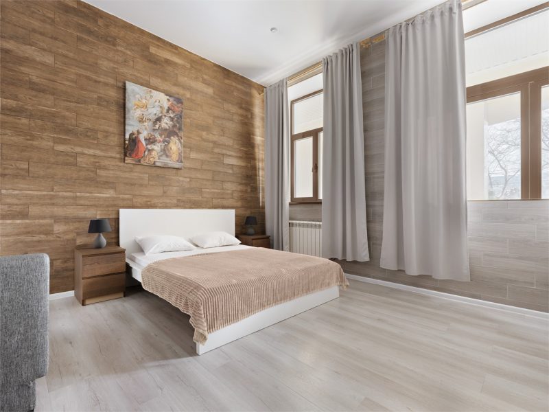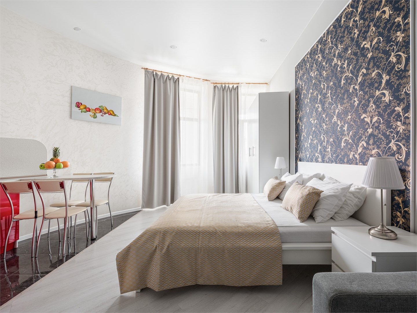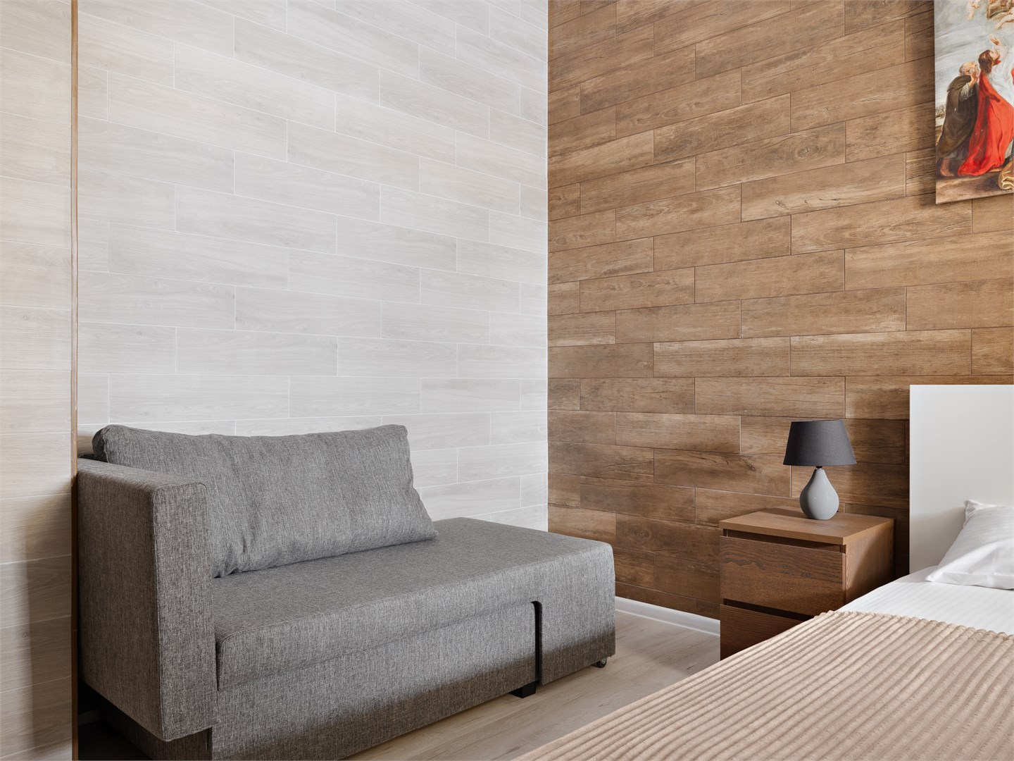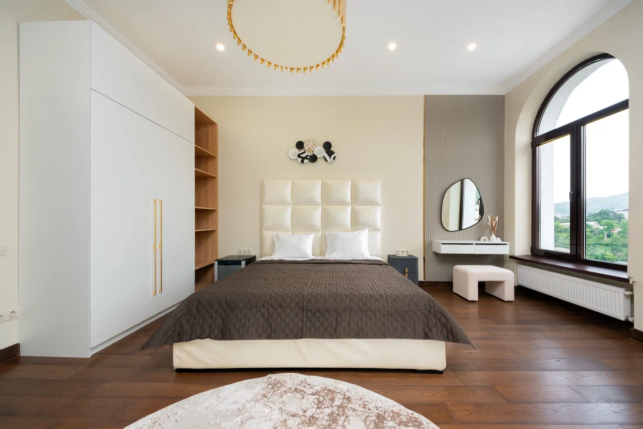 Мебель: двуспальная кровать, раскладной диван, шкаф для одежды, обеденный стол, стулья.
