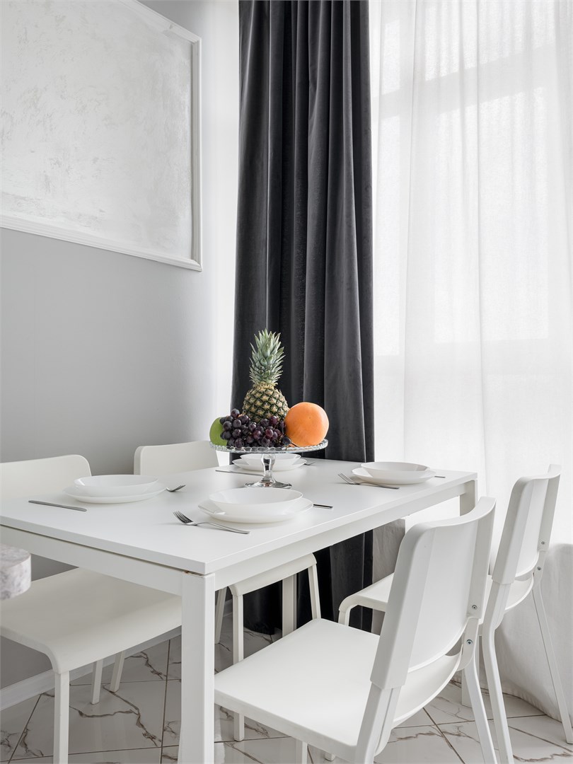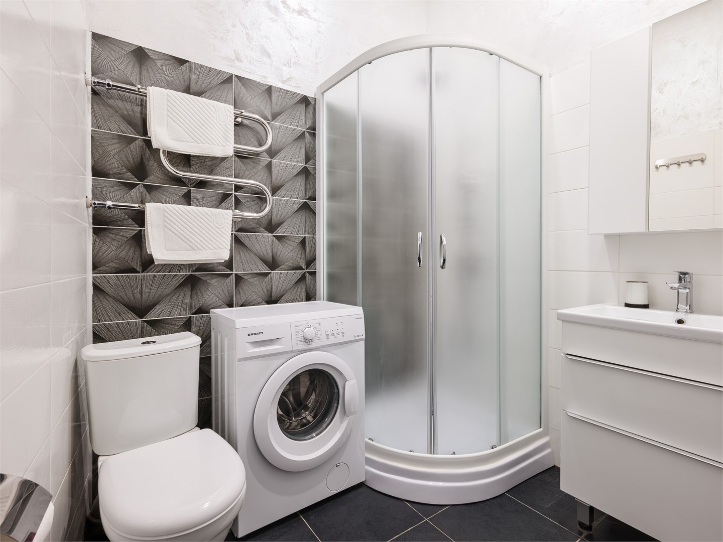 Оборудование: телевизор Smart TV, холодильник, микроволновка, чайник, чайные пары, столовые приборы, тарелки, вентилятор, стиральная машина.