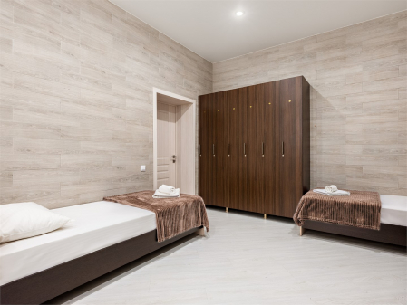 Мебель: четыре односпальные кровати, шкаф для одежды, обеденный стол, стулья.