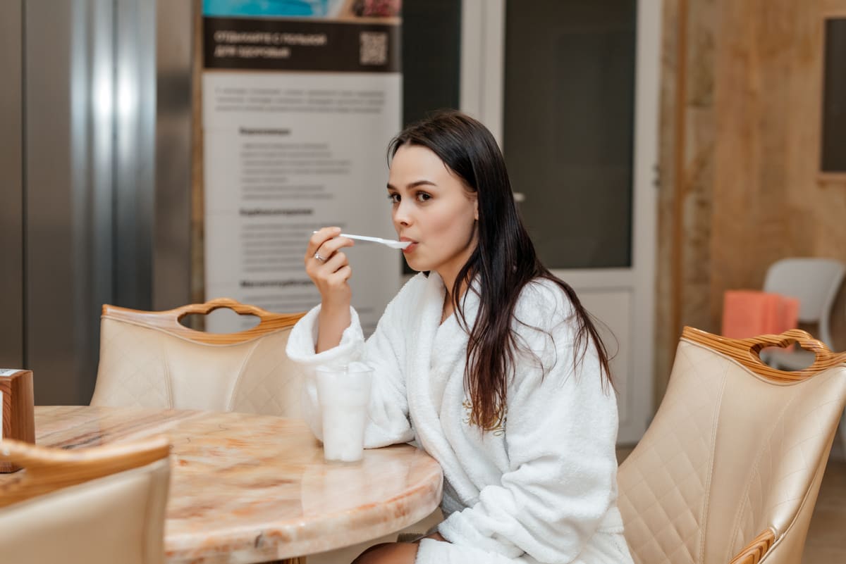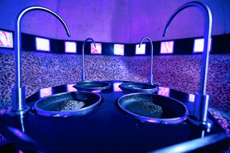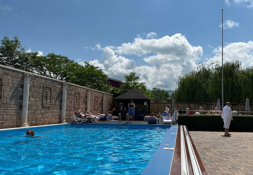 Большой крытый бассейн с панорамной крышей — большой плюс здравницы. Кроме того, есть бювет с минеральной водой, которую привозят в санаторий 2 раза в день, чтобы она не теряла своих лечебных свойств.