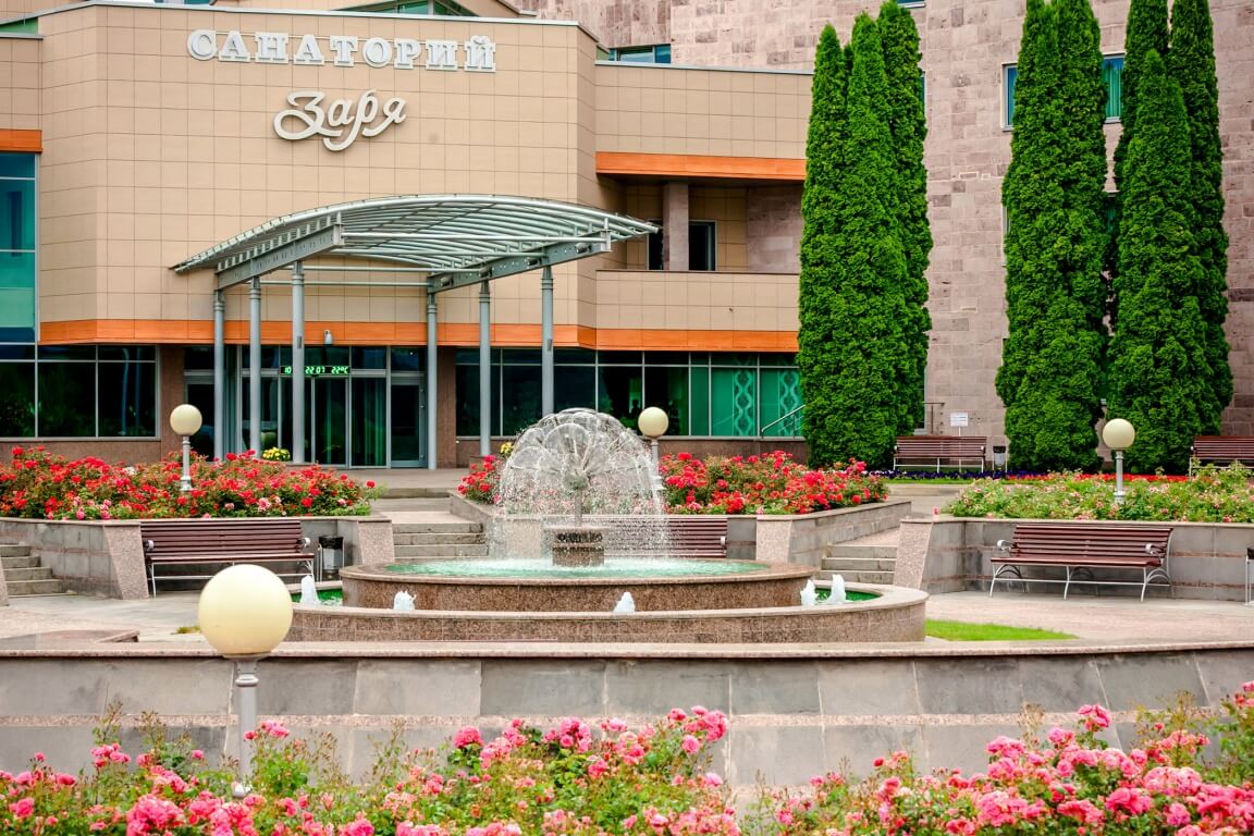 «Заря» представляет собой единый комплекс, состоящий из трех зданий. Для удобства и комфорта перемещения гостей между корпусами они соединены теплым переходом. Корпуса оснащены лифтами, все службы и номера расположены очень удобно. Лечебный корпус дополнительно оборудован бюветом, подающим сульфатный Нарзан.