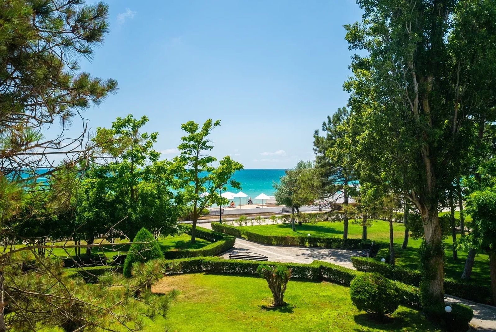 - Реабилитационный — 25 м до моря, адаптирован для маломобильных гостей (пандусы, лифты, широкие дверные проёмы)