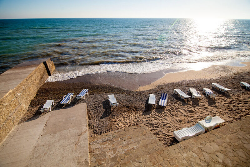 Первая береговая линия с собственным песчано-галечным пляжем, шезлонгами, зонтиками и выдачей полотенец. На территории пляжа работает ресторан