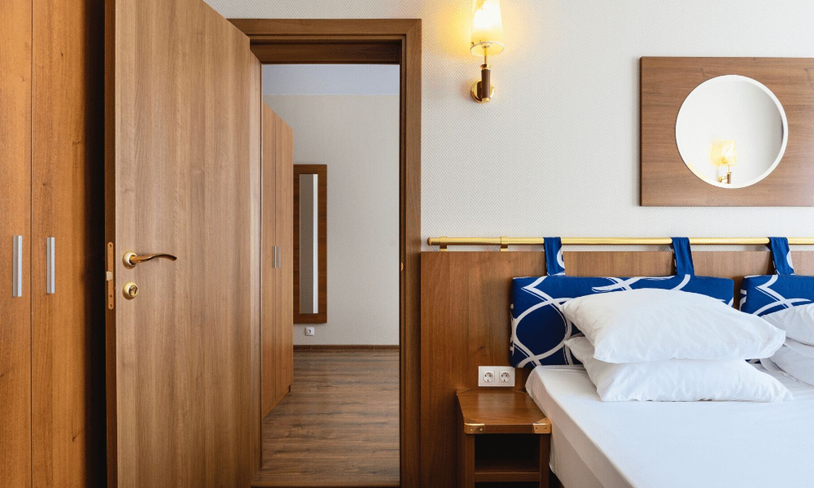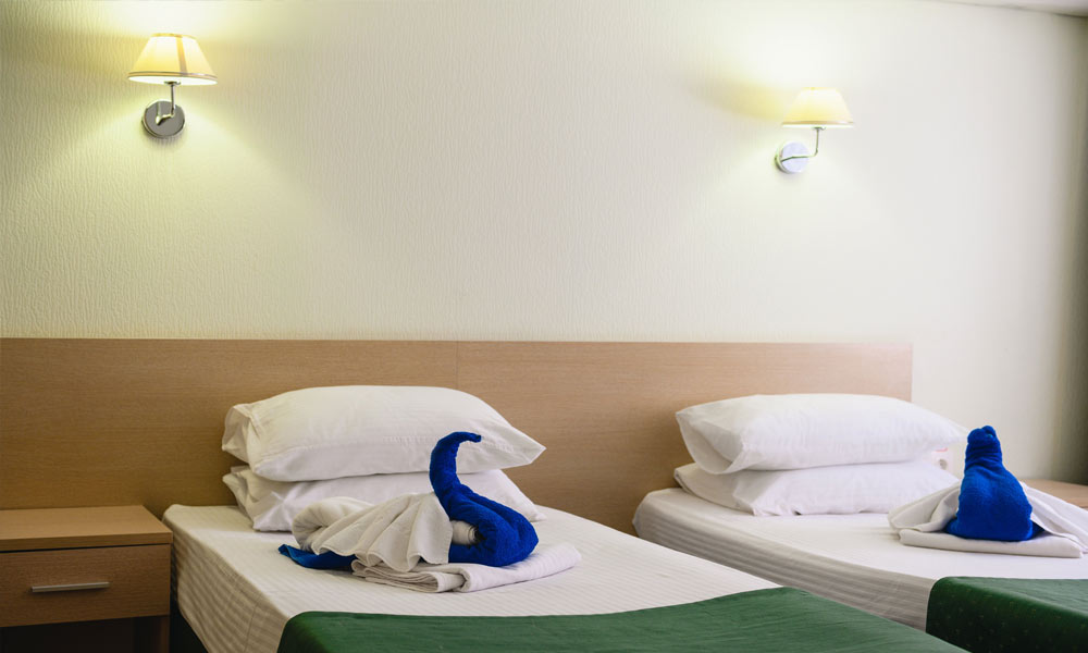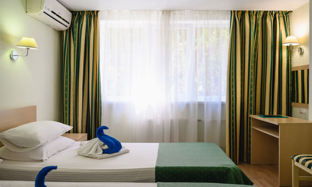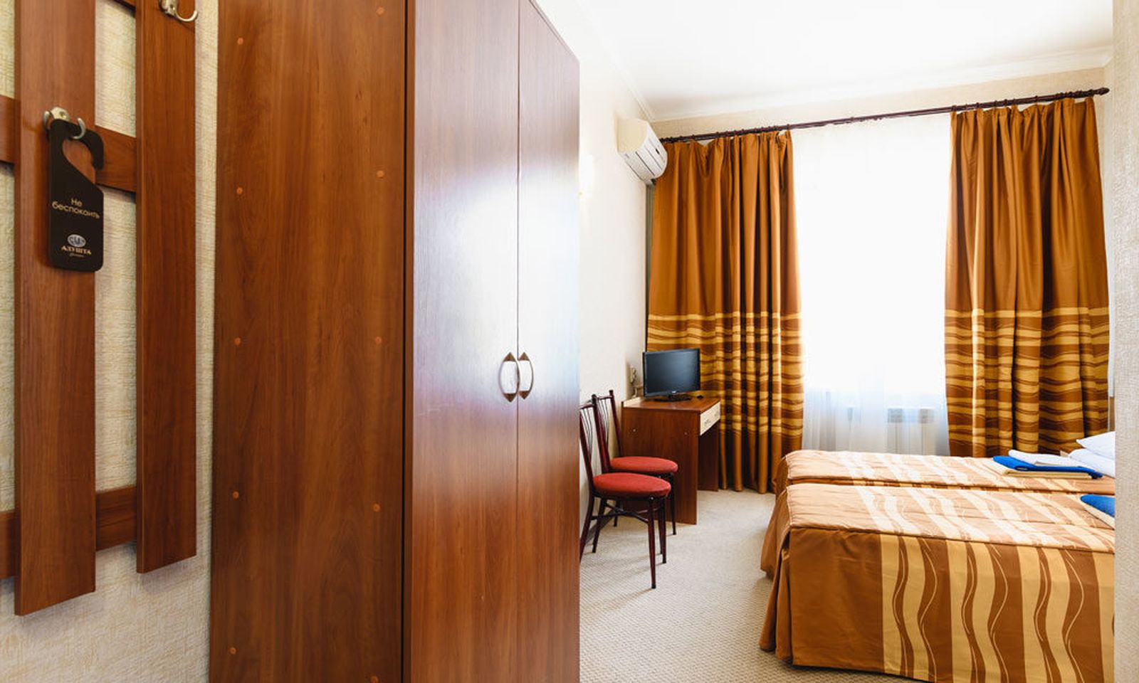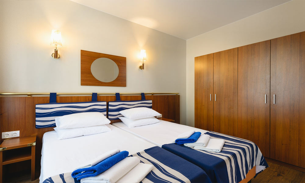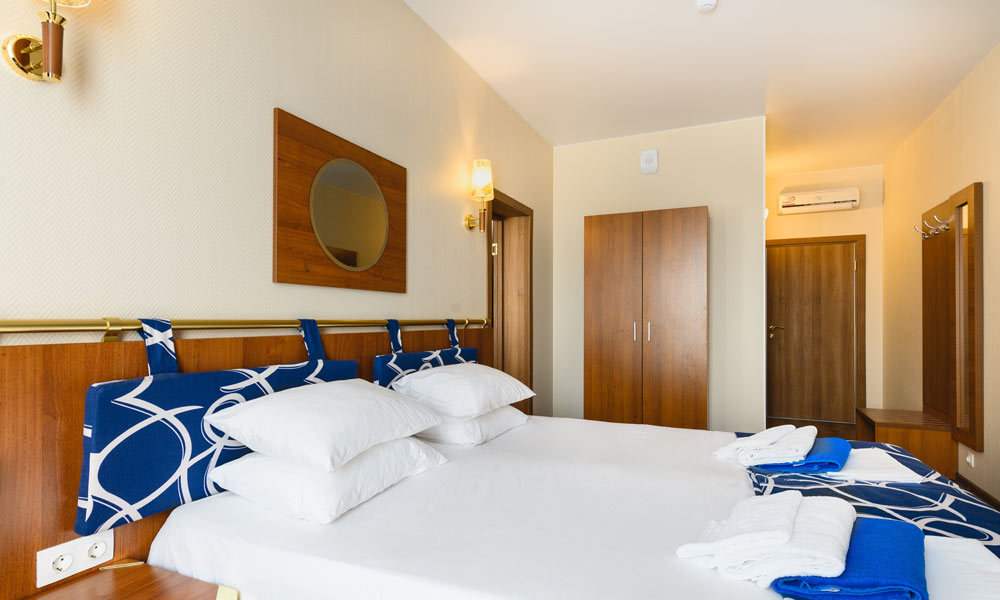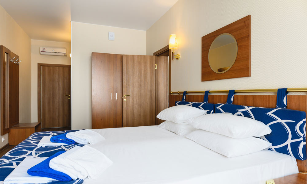 Мебель: Две раздельные односпальные кровати или двуспальная кровать, шкаф, тумбочки, еврораскладушка.