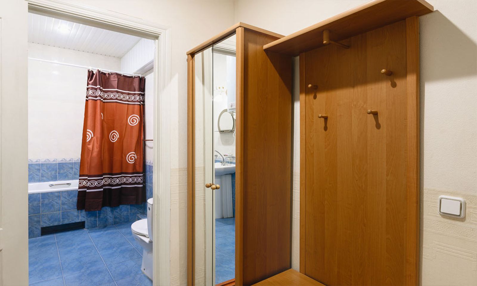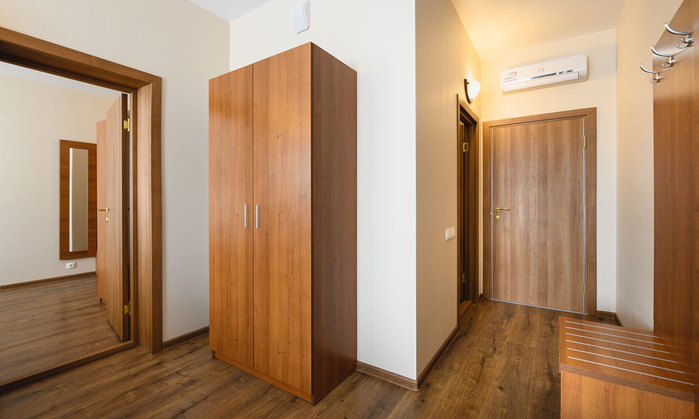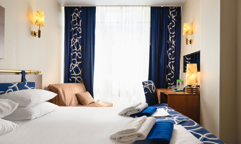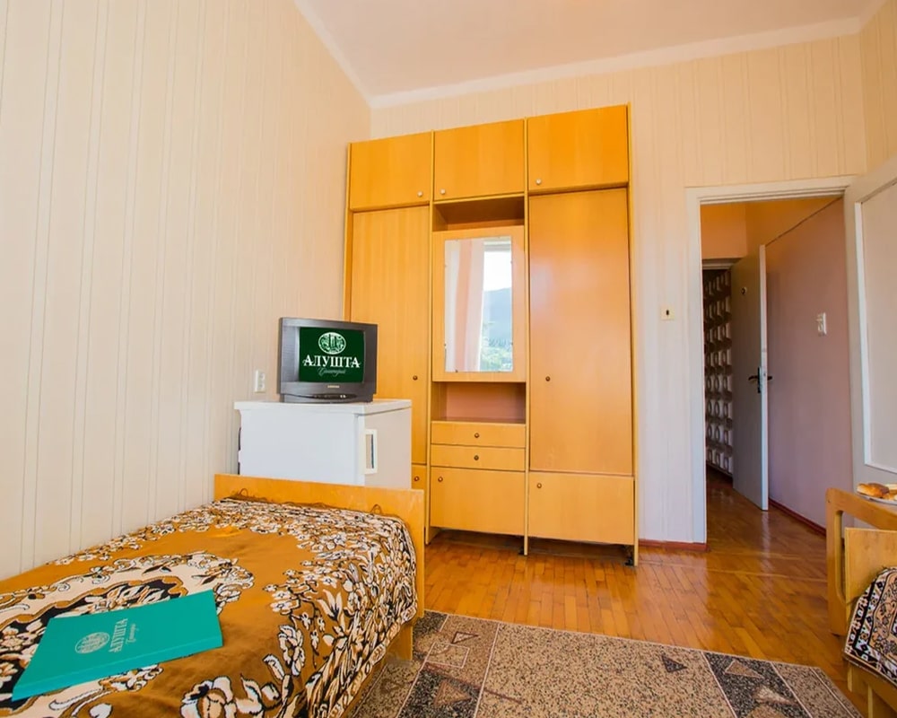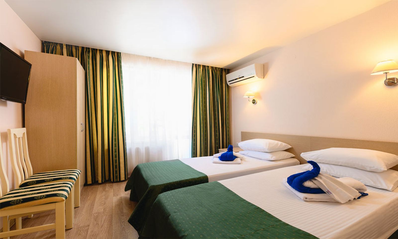 Мебель: Две раздельные односпальные кровати или двуспальная кровать, шкаф, тумбочки, еврораскладушка.