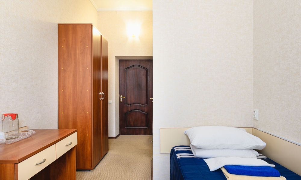 Мебель: Односпальная кровать, шкаф, тумбочки.